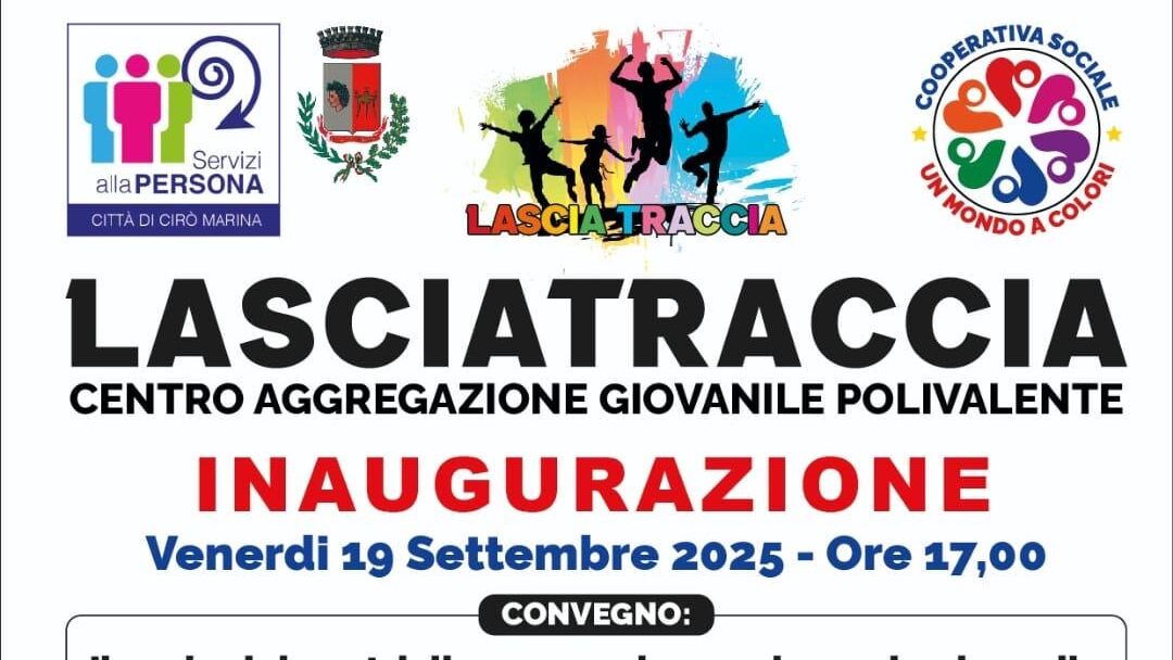 Cirò Marina – Un nuovo spazio dedicato ai giovani e alla comunità apre ufficialmente le sue porte a Cirò Marina. Venerdì 19 settembre 2025, alle ore 17:00, si terrà l’inaugurazione del Centro Aggregazione Giovanile Polivalente “Lasciatraccia”, promosso dal Comune di Cirò Marina – Servizi alla Persona e gestito dalla Cooperativa Sociale “Un mondo a colori”.