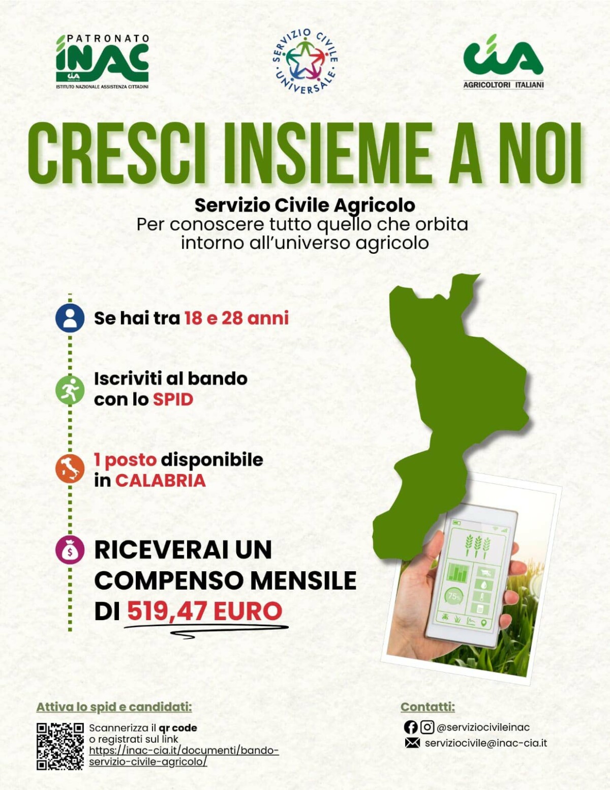 Cia Calabria, tramite il suo Patronato Inac, ha avviato la selezione di 57 giovani volontari per il servizio civile in 16 regioni italiane, con un’opportunità anche per la Calabria. In particolare, presso la sede regionale di Lamezia Terme è disponibile un posto (1) per il progetto “Sportelli di facilitazione agricola”. Il progetto prevede il potenziamento degli sportelli territoriali per la consulenza e l’informazione sulle pratiche agricole, le normative, i finanziamenti e i servizi a supporto delle imprese agricole, un’occasione straordinaria per mettersi in gioco, confrontarsi con le sfide del settore agricolo e arricchire il proprio percorso professionale con esperienze dirette e qualificanti.