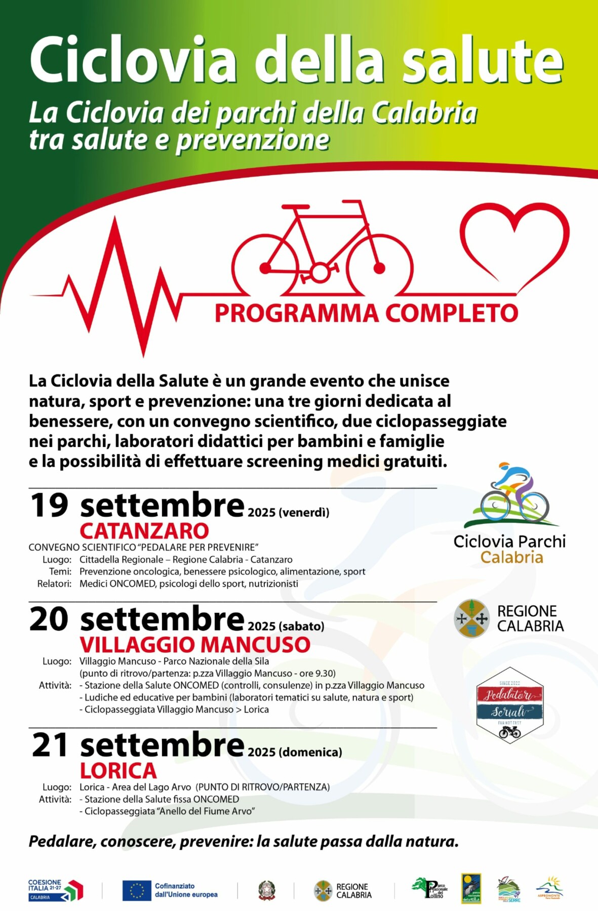 Pedalare conoscere prevenire: tre giorni per unire salute, benessere e natura, pedalando nei parchi della Calabria. Dal 19 al 21 settembre si svolgerà la prima edizione della “Ciclovia della Salute”, un evento che nasce per valorizzare la Ciclovia dei Parchi della Calabria come strumento di promozione di stili di vita sani e di prevenzione.