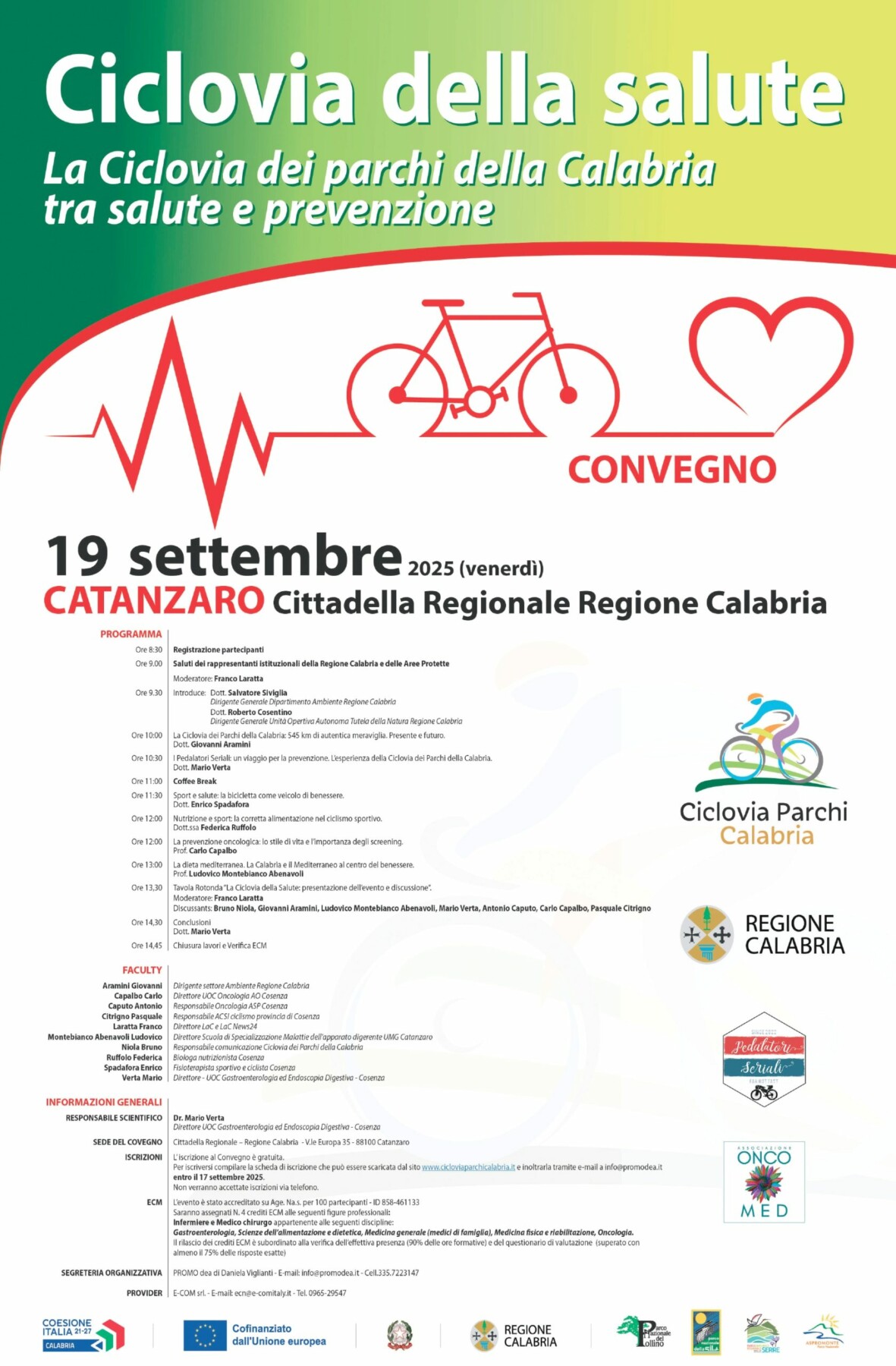 Il programma prevede un convegno scientifico dal titolo “Pedalare per prevenire”, in programma venerdì 19 settembre presso la Cittadella regionale a Catanzaro, con la partecipazione di medici dell’associazione OncoMed, psicologi, nutrizionisti e specialisti dello sport. I lavori offriranno spunti e dati sul rapporto tra attività fisica, corretta alimentazione e prevenzione oncologica e cardiovascolare.