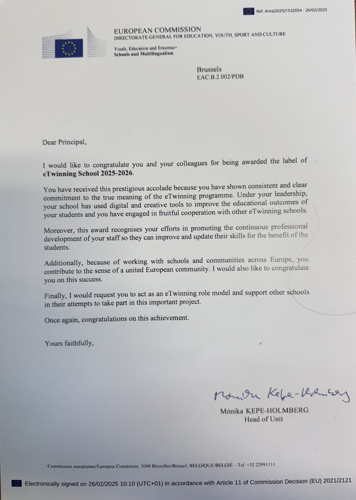 vorrei congratularmi con lei e con i suoi colleghi per aver ricevuto la certificazione di Scuola eTwinning 2025/2026.