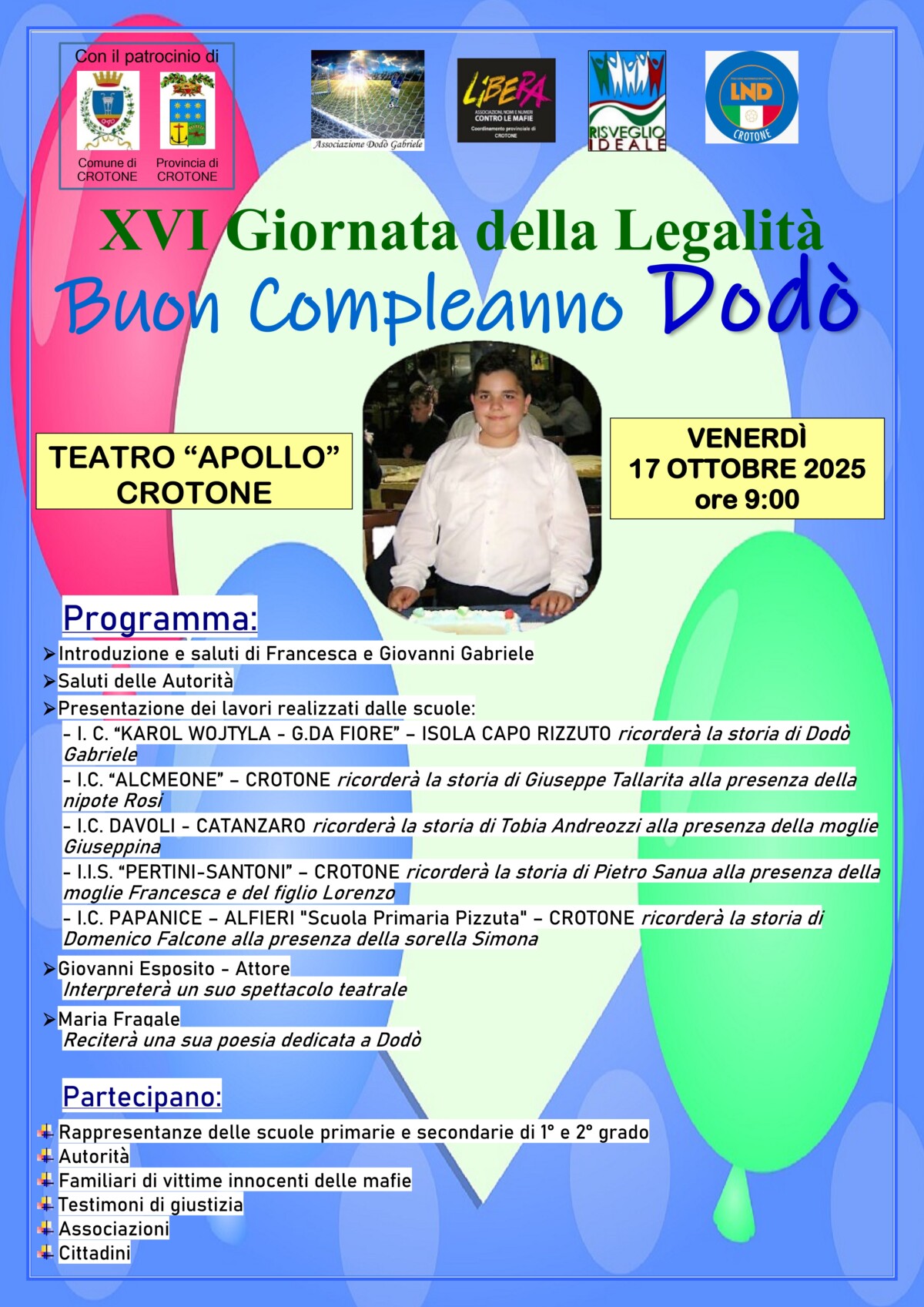 Crotone, venerdì 17 ottobre 2025 – Al Teatro “Apollo” di Crotone, a partire dalle ore 9:00, si terrà la XVI Giornata della Legalità – Buon compleanno Dodò, un appuntamento ormai divenuto simbolo di memoria, impegno civile e speranza per le nuove generazioni. L’evento, organizzato con il patrocinio del Comune di Crotone, della Provincia di Crotone, di Libera – Contro le mafie, dell’associazione Risveglio Ideale e della Lega Nazionale Dilettanti – Comitato Crotone, ricorderà la storia di Domenico “Dodò” Gabriele, il bambino di soli 11 anni vittima innocente di mafia, ucciso nel 2009 mentre giocava a calcio.