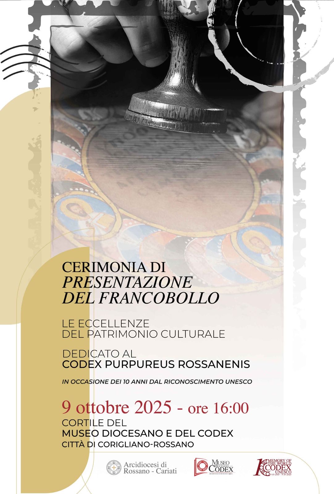 Si terrà oggi, giovedì 9 ottobre 2025, alle ore 16:00, nel chiostro del Museo Diocesano e del Codex di Corigliano-Rossano, la presentazione ufficiale del francobollo dedicato al Codex Purpureus Rossanensis, emesso dal Ministero delle Imprese e del Made in Italy e distribuito da Poste Italiane. L’iniziativa rientra nella serie tematica “Le Eccellenze del patrimonio culturale italiano” e celebra il decennale dell’iscrizione del prezioso Evangelario nella lista “Memory of the World” dell’UNESCO, avvenuta nel 2015.