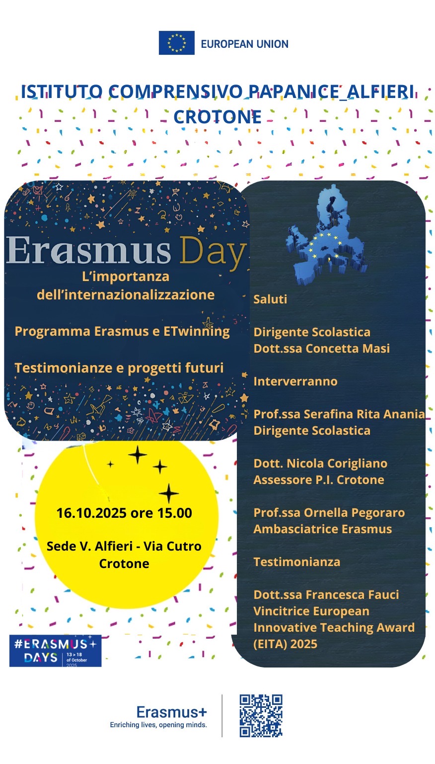 L’Istituto Comprensivo Papanice celebra l’Erasmus Day il 16 ottobre alle ore 15.00 presso la sede di via Cutro, con un incontro dedicato al valore dell’internazionalizzazione e alla crescita delle competenze europee nella scuola.