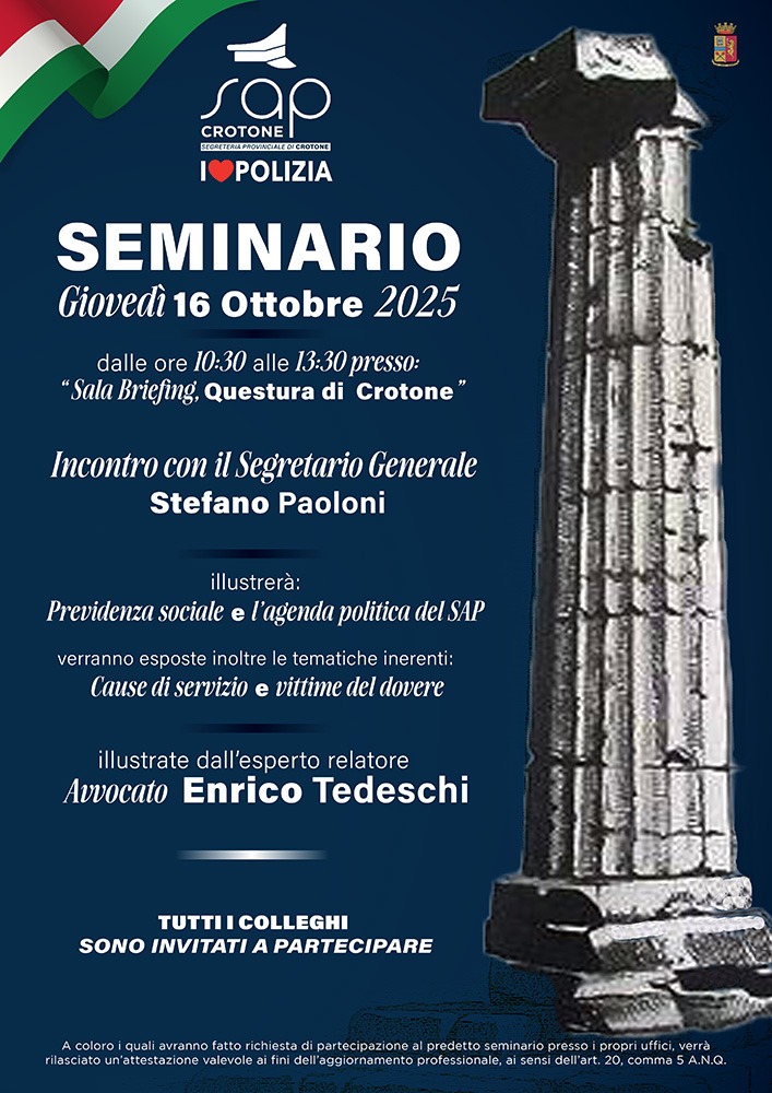 CROTONE – Giovedì 16 ottobre 2025, presso la Questura di Crotone, si terrà un importante Seminario di aggiornamento organizzato dal SAP – Sindacato Autonomo di Polizia, dedicato ai temi della previdenza sociale, delle cause di servizio e delle vittime del dovere.