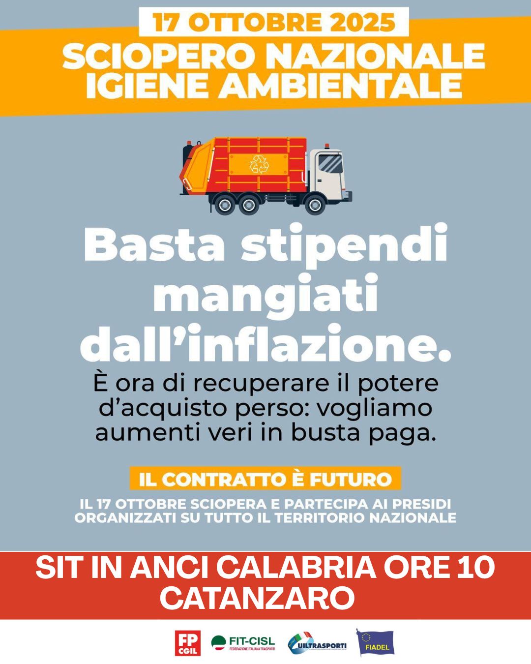 Il 17 Ottobre in occasione dello Sciopero Nazionale Unitario dei Servizi Ambientali proclamato da Fp Cgil, Fit Cisl, Uil Trasporti e Fiadel si terrà un sit in davanti alla sede Anci Calabria di Catanzaro alle ore 10.