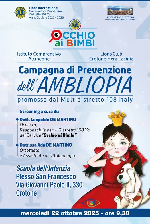 Crotone, 22 ottobre 2025 – Sensibilizzare le famiglie sull’importanza della prevenzione visiva nei più piccoli: è questo l’obiettivo della Campagna di Prevenzione dell’Ambliopia “Occhio ai Bimbi”, promossa dal Multidistretto Lions 108 Italy, con il supporto del Lions Club Crotone Hera Lacinia e dell’Istituto Comprensivo Alcmeone.