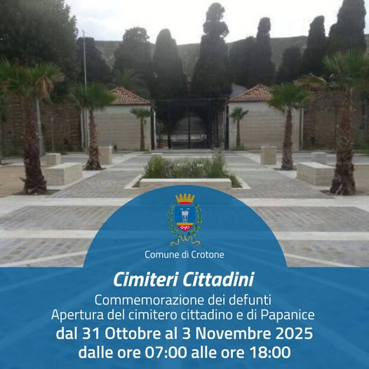 In occasione della Commemorazione dei Defunti con ordinanza sindacale sono stati stabiliti i seguenti orari di apertura al pubblico dei cimiteri cittadini di viale Gramsci e di viale Calabria (Papanice): dalle ore 7.00 alle ore 18.00 orario continuato dal 31 ottobre al 3 novembre 2025