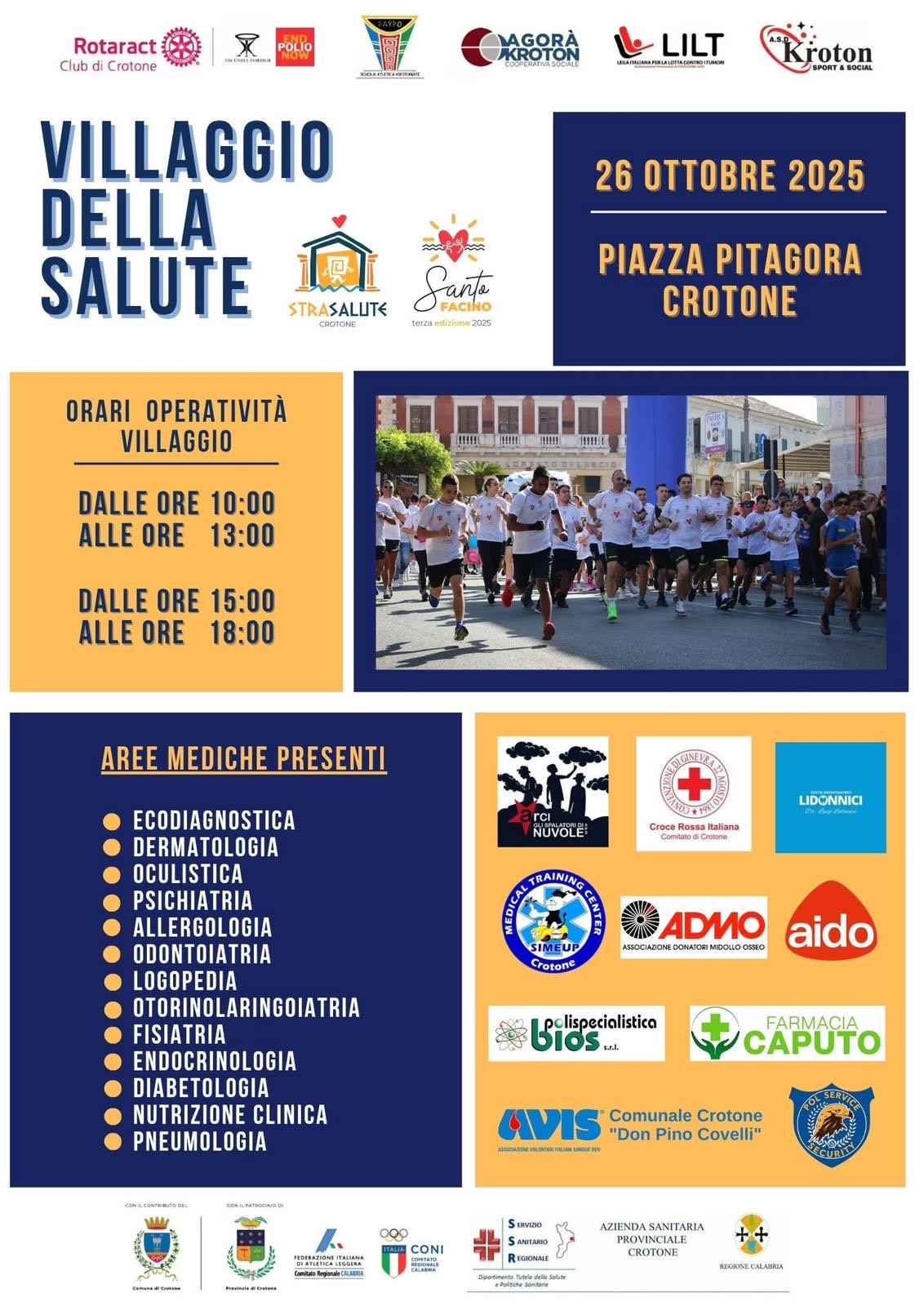 CROTONE, 23/10/2025– Domenica 26 ottobre 2025, via Vittorio Veneto diventerà il cuore pulsante della prevenzione grazie al Villaggio della Salute, iniziativa promossa da Rotaract Club di Crotone, Scuola Atletica Krotoniate – SAKRO, Agorà Kroton Cooperativa Sociale, LILT – Lega Italiana per la Lotta contro i Tumori e ASD Kroton Sport & Social, con il patrocinio di Comune e Provincia di Crotone, CONI e Regione Calabria.