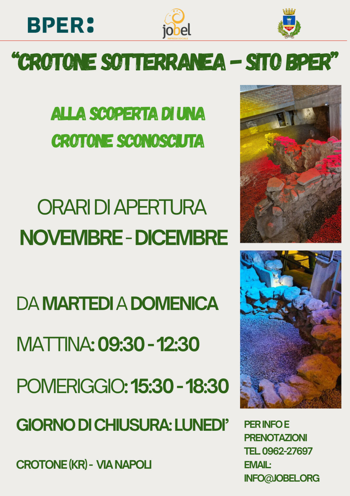 Crotone, 04/11/2025 — Crotone Sotterranea – Sito Bper amplia i propri orari di apertura per il periodo invernale: dal 4° novembre al 31 dicembre 2025.