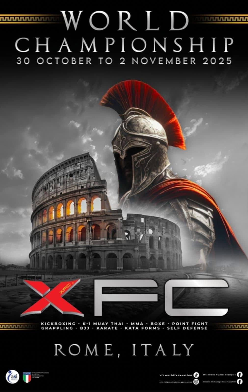 Si è conclusa con uno straordinario successo la sesta edizione del Campionato Mondiale XFC (Xtreme Fight Combat), svoltasi dal 30 ottobre al 2 novembre 2025 a Pomezia (Roma), sotto l’egida dell’ASI – Associazioni Sportive e Sociali Italiane.