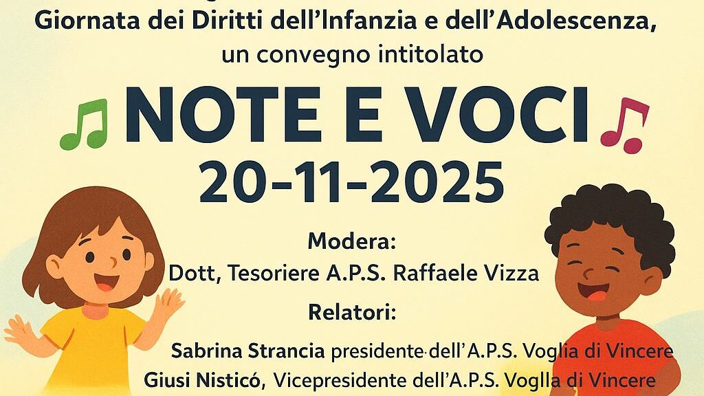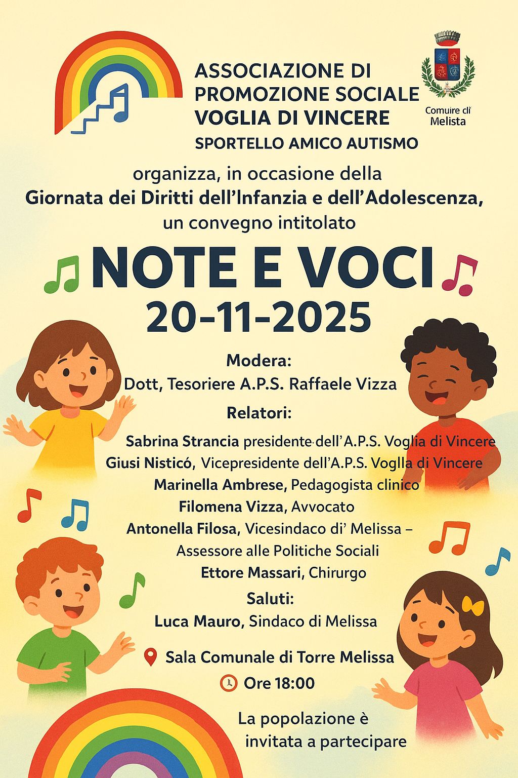In occasione della Giornata dei Diritti dell’Infanzia e dell’Adolescenza, l’Associazione di Promozione Sociale “Voglia di Vincere” – Sportello Amico Autismo organizza un importante convegno dal titolo “Note e Voci”, che si terrà il 20 novembre 2025, alle ore 18:00, presso la Sala Comunale di Torre Melissa.