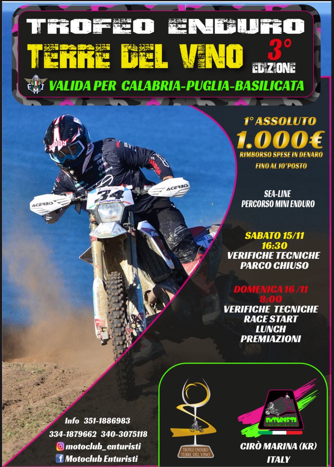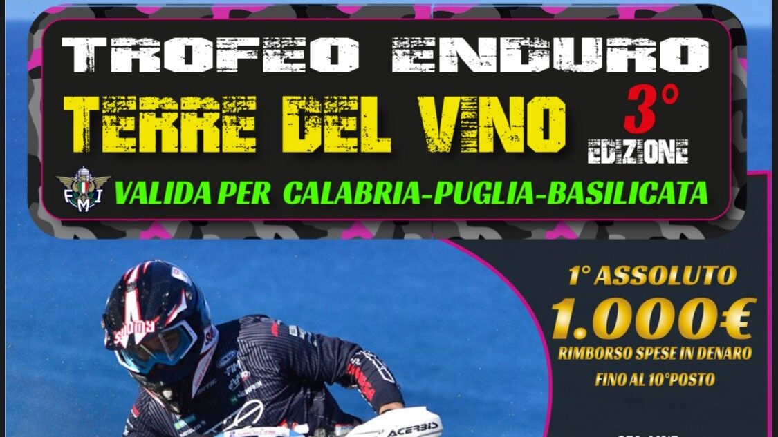 Tutto pronto per la terza edizione del Trofeo Enduro “Terre del Vino”, una manifestazione sportiva che ormai rappresenta un appuntamento fisso per gli appassionati delle due ruote nel Sud Italia. L’evento, organizzato dal Moto Club Enturisti, è valido per i campionati di Calabria, Puglia e Basilicata e si svolgerà nel suggestivo scenario marino di Cirò Marina.