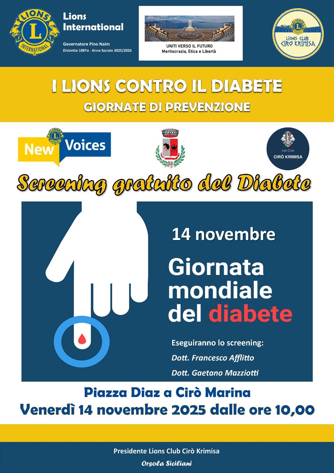 Ancora una volta il Lions Club Cirò Krimisa è stato in prima linea nella lotta contro il diabete, confermando il proprio impegno, come ogni anno, attraverso screening gratuiti, eventi e promozione di stili di vita corretti. La Presidente del Club Orsola Siciliani e tutti i soci ringraziano l’Amministrazione Comunale e il Comando della Polizia Municipale per la cortese e consueta disponibilità. We serve: la salute è un dono, la prevenzione è un diritto. Cirò Marina, 14 novembre 2025.