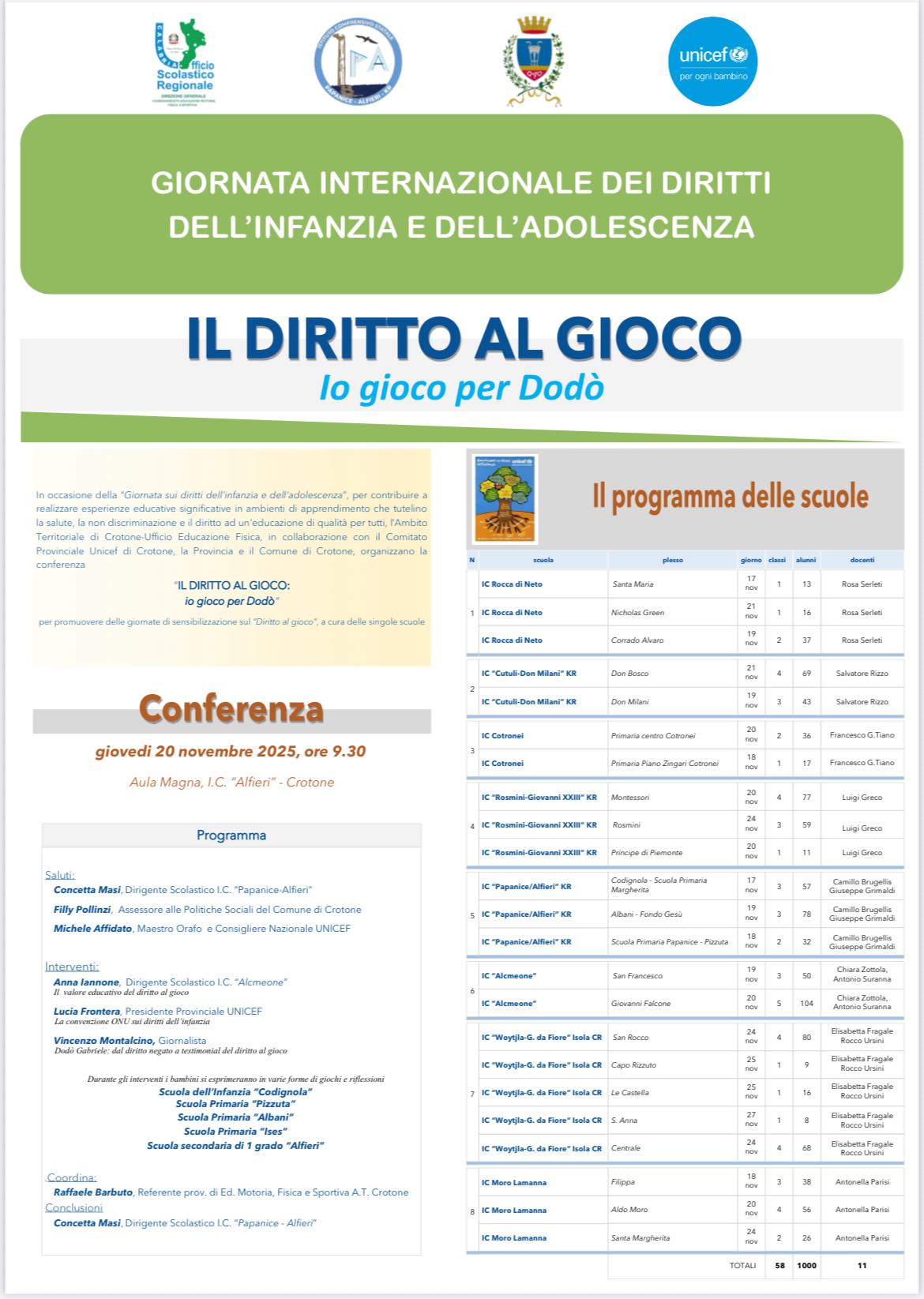 In occasione della Giornata Mondiale dei Diritti dell’Infanzia e dell’Adolescenza, l’Ambito territoriale di Crotone, ufficio educazione fisica, e l’Istituto Comprensivo Papanice Alfieri organizzano la conferenza “Il diritto al gioco – Io gioco per Dodò”, un momento di riflessione e partecipazione dedicato al valore universale del gioco come strumento di crescita, libertà e inclusione, in memoria del piccolo Dodò Gabriele.