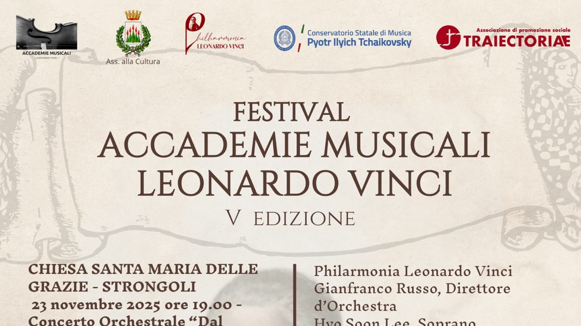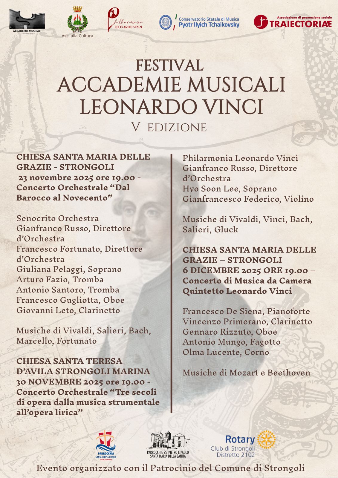 La Quinta edizione delle Accademie Musicali Leonardo Vinci di Strongoli, si apre con il concerto diretto dal Maestro Gianfranco Russo, e vede la collaborazione dell’Assessorato alla Cultura del Comune di Strongoli, del Conservatorio Statale di Musica Pyotr Ilich Tchaikovsky, dell’Associazione Traiectoriae e del Rotary Club di Strongoli. L’evento è stato organizzato dal direttivo delle Accademie presieduto dall’avvocato Stefania Leotta, dal Direttore di Produzione dr.ssa Rosalba Cotrone, e dai due Direttori artistici, il Maestro Francesco De Siena e il Maestro Gianfranco Russo, che da oltre cinque anni si propongono di far conoscere l’Opera di Leonardo Vinci attraverso Concerti, allestimenti degli Intermezzi Barocchi, Convegni, e commissioni di nuovi progetti artistici e culturali.