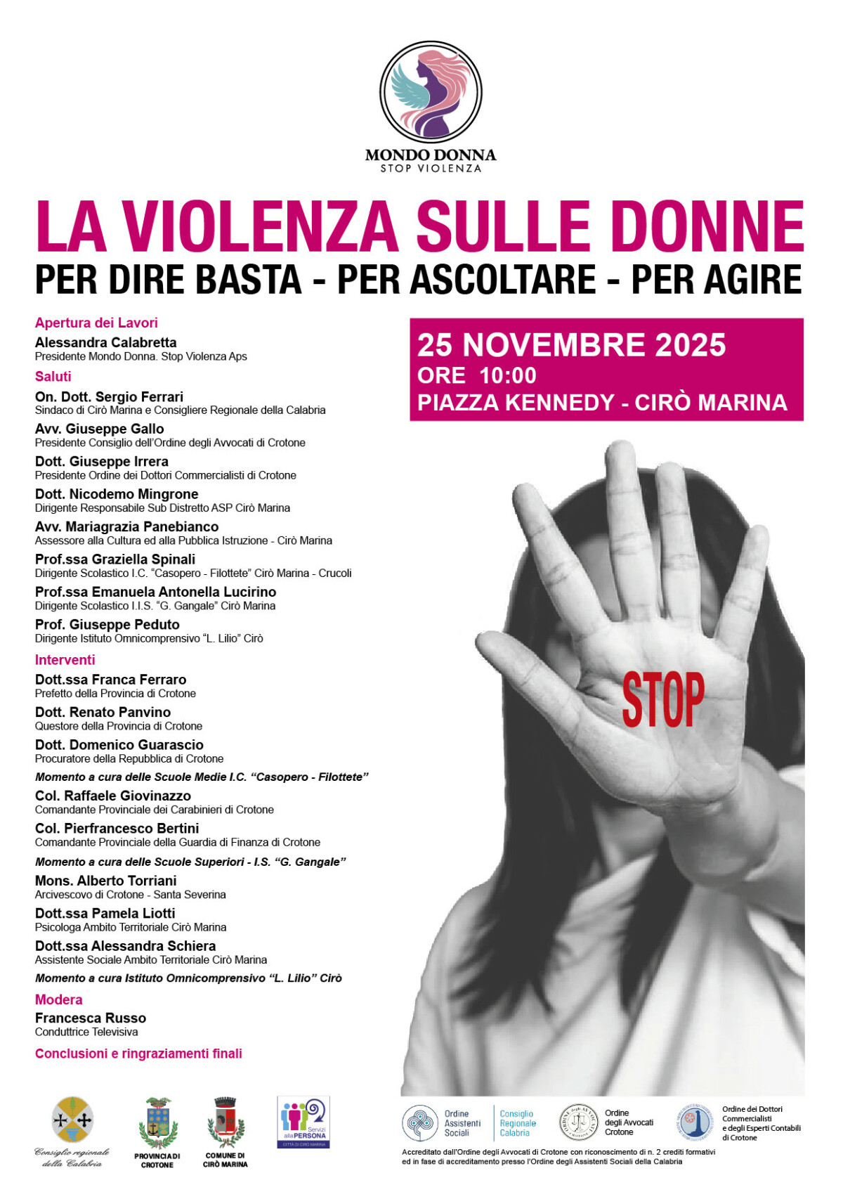 L’apertura dei lavori sarà affidata alla Presidente di Mondo Donna – Stop Violenza APS, Alessandra Calabretta, che introdurrà il tema centrale della giornata: un impegno condiviso per contrastare ogni forma di violenza di genere, attraverso ascolto, prevenzione, rete territoriale e sostegno alle vittime.