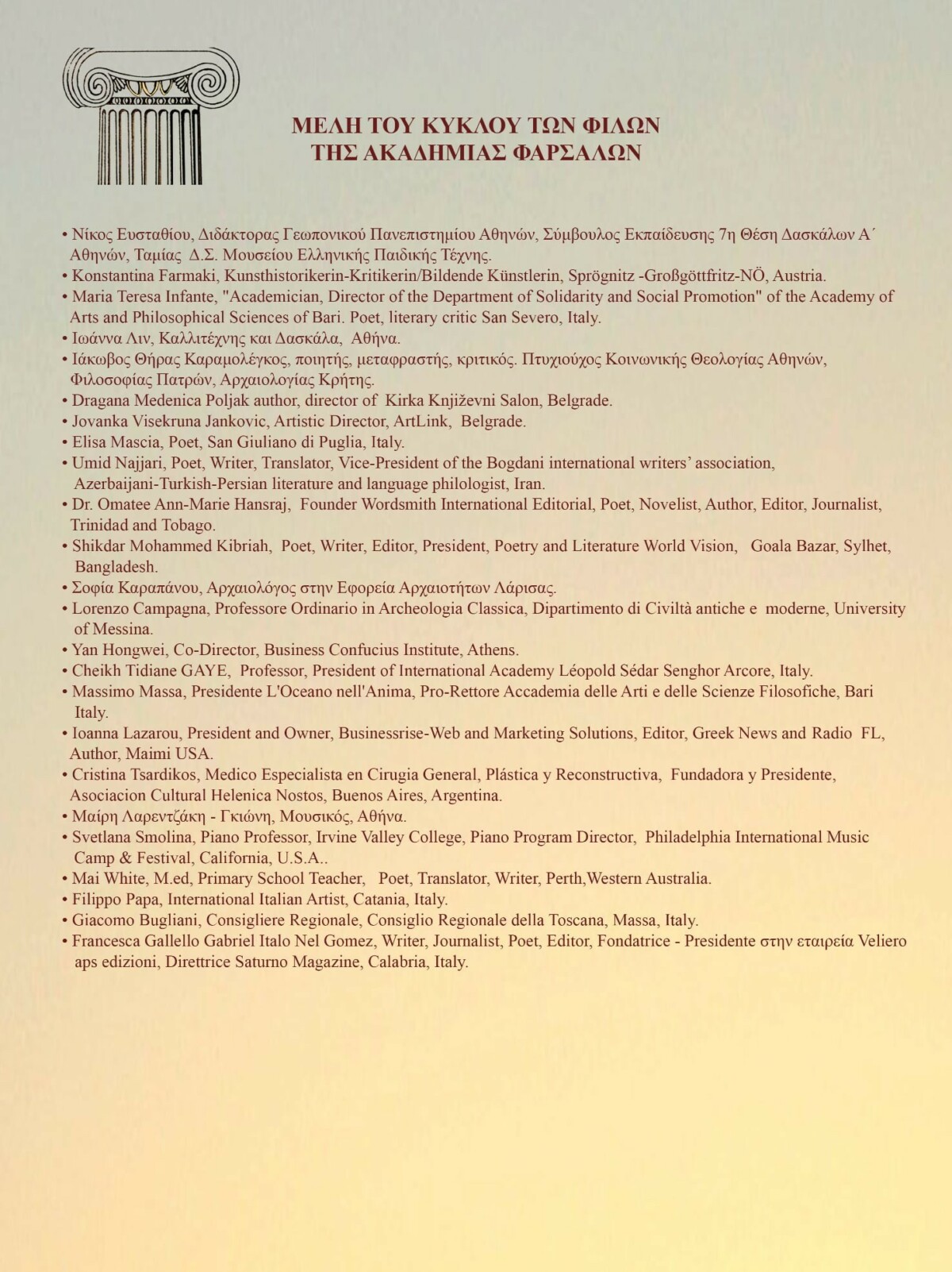L’Accademia di Farsala, fondata e presieduta dal Prof. Yannis Fikas, è un centro culturale di respiro internazionale che promuove filosofia, civiltà antiche, teatro greco, Shakespeare, musica classica, musei e siti archeologici. Attraverso programmi educativi, pubblicazioni e collaborazioni con studiosi e artisti di tutto il mondo, l’Accademia offre uno spazio di dialogo e ricerca, collegato a oltre settanta città a livello globale. Il Prof. Fikas, filosofo e autore di numerose opere, è stato docente alla State University of New York, visiting professor all’Università di Atene e Direttore delle discipline umanistiche al BCA College. La sua visione umanistica e illuminata ha reso l’Accademia un faro culturale nel Mediterraneo.