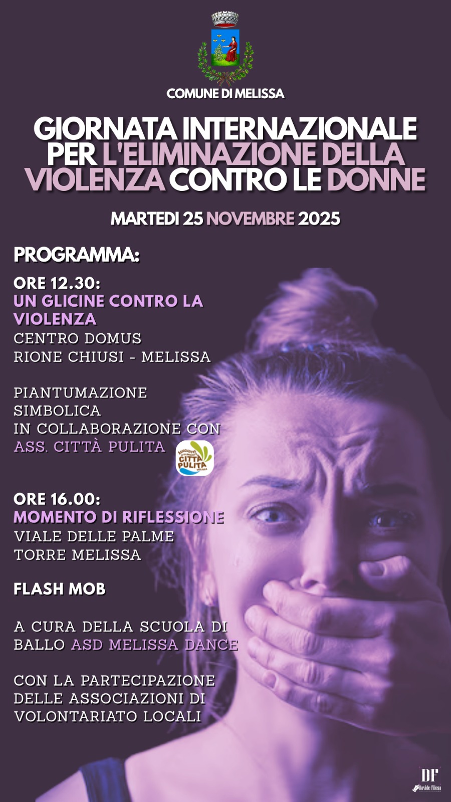 Martedì 25 novembre 2025 il Comune di Melissa aderisce alla Giornata internazionale per l’eliminazione della violenza contro le donne con un programma ricco di iniziative, rivolto all’intera cittadinanza e costruito insieme alle realtà associative del territorio. Una giornata dal forte valore simbolico, pensata per sensibilizzare, educare e coinvolgere, con particolare attenzione ai giovani.