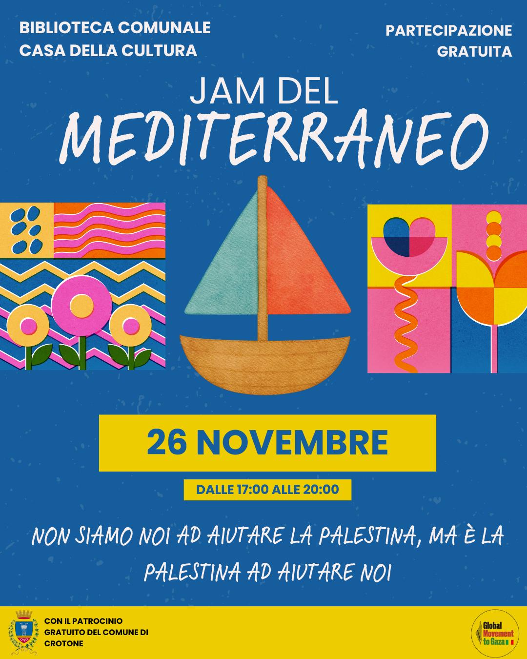 Il Global Movement to Gaza – Calabria, con il patrocinio gratuito della Città di Crotone e il coinvolgimento delle volontarie e dei volontari del gruppo Crotone per la Palestina, invita la stampa, le radio e la cittadinanza a partecipare alla Jam del Mediterraneo – Jam per la Palestina, l’evento conclusivo di un percorso artistico collettivo e multigenerazionale nato dai tre laboratori realizzati nelle scorse settimane.