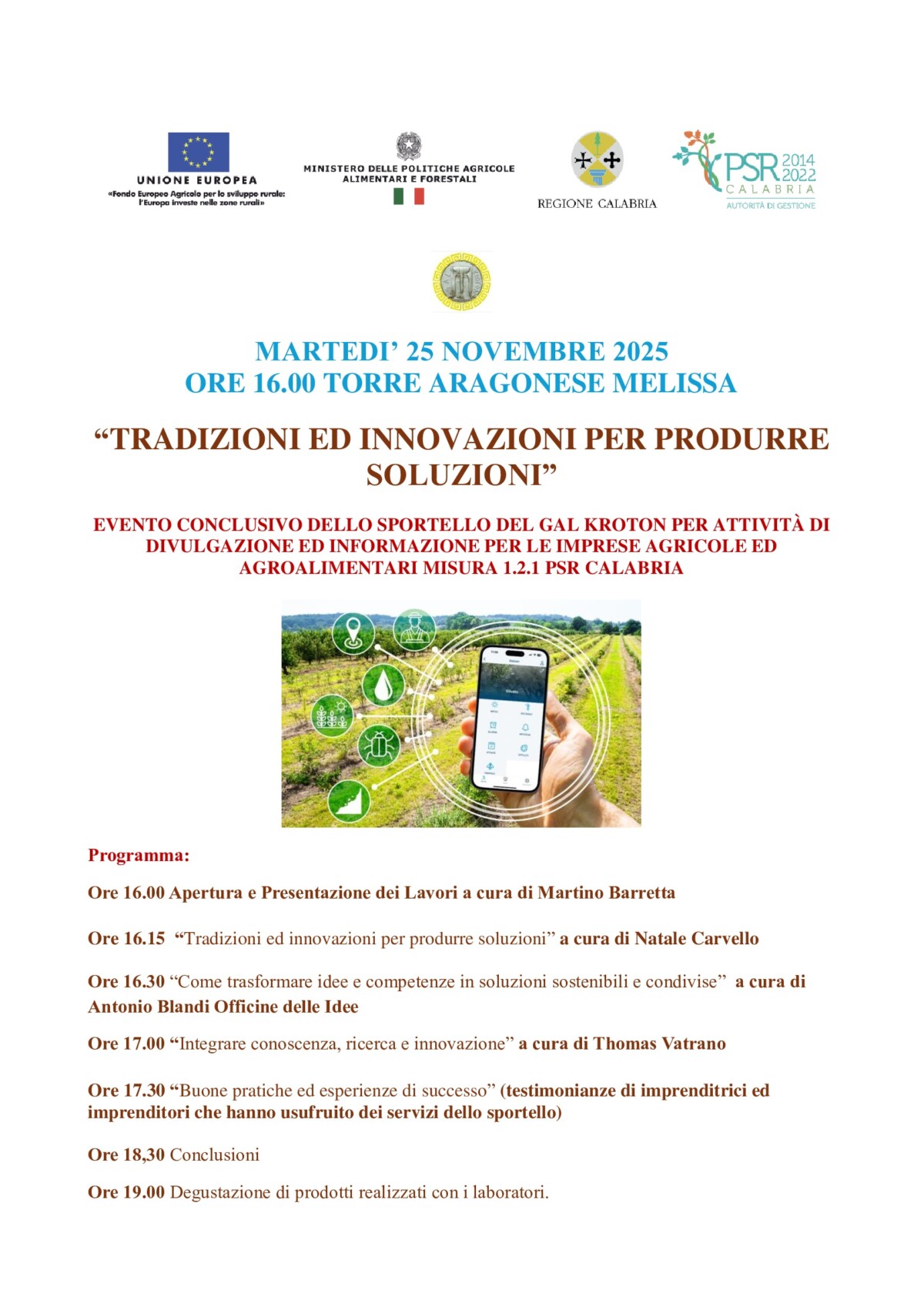 Il GAL Kroton organizza l’evento finale dello Sportello informativo attivato nell’ambito della Misura 1.2.1 del PSR Calabria, dedicato alle attività divulgative e dimostrative rivolte alle aziende agricole e agroalimentari del territorio.