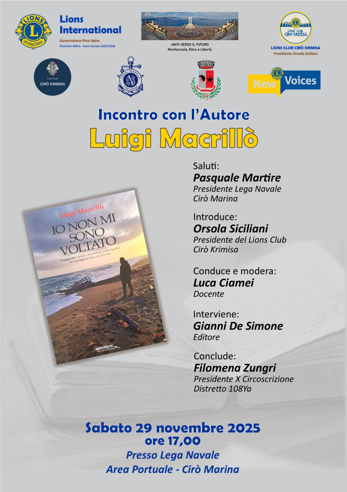 Sabato, 29 novembre, presso la sede della Lega Navale di Cirò Marina, il Lions Club Cirò Krimisa ha promosso l’incontro con Luigi Macrillò, autore del libro “ IO NON MI SONO VOLTATO”, commovente e toccante ricordo della tragedia di Cutro, attraverso il quale l’autore ha inteso rendere omaggio alle vittime e ai volontari protagonisti di quella drammatica vicenda.