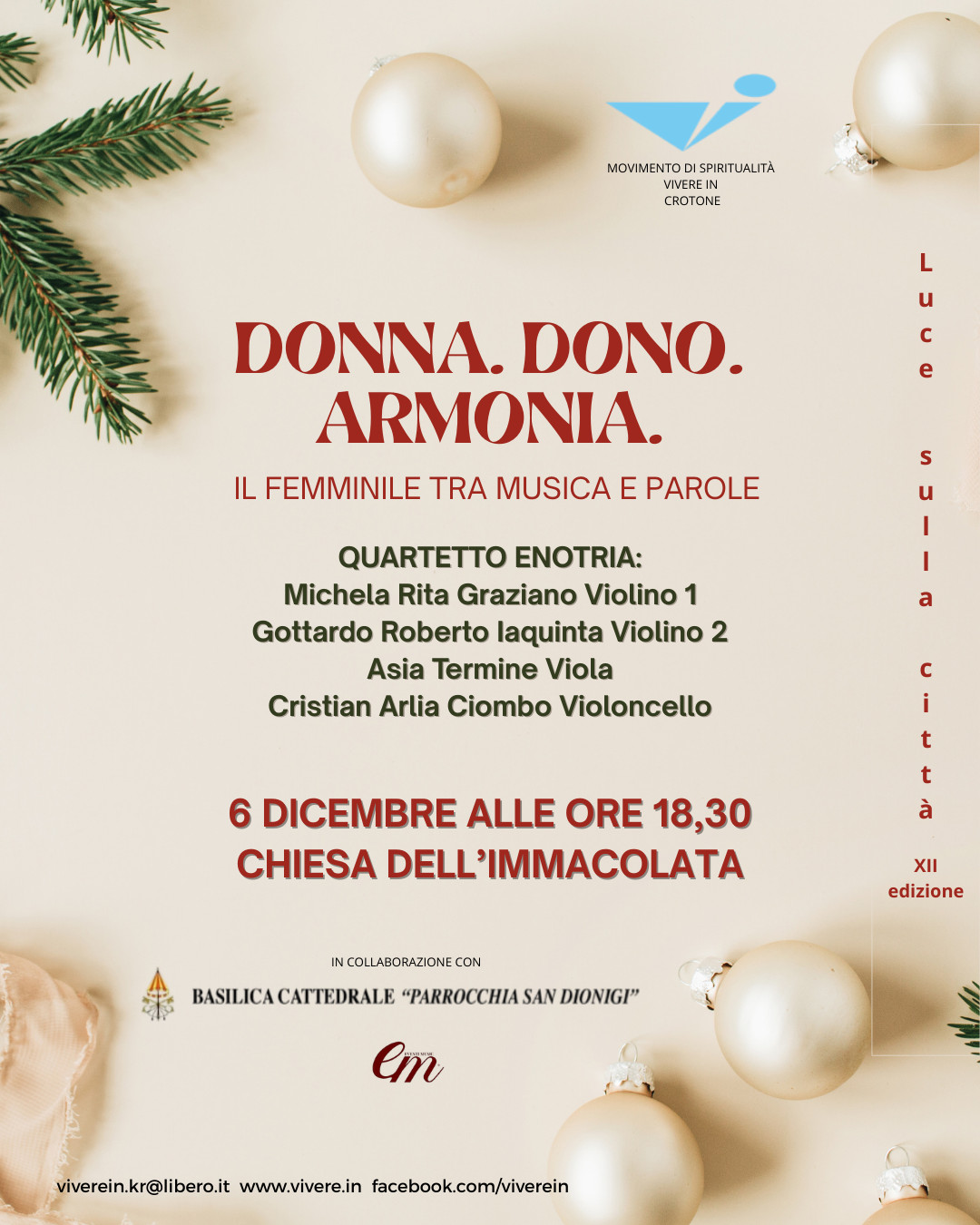 Con questa iniziativa vogliamo celebrare la dignità e la preziosità della donna per costruire relazioni veramente umane. Proponendo il dialogo tra parole e musica come stimolo per la ricerca di armonia in ogni ambito del vivere, invitiamo quanti vorranno condividere questo momento sabato 6 dicembre alle ore 18,30 presso la Chiesa dell’Immacolata di Crotone.