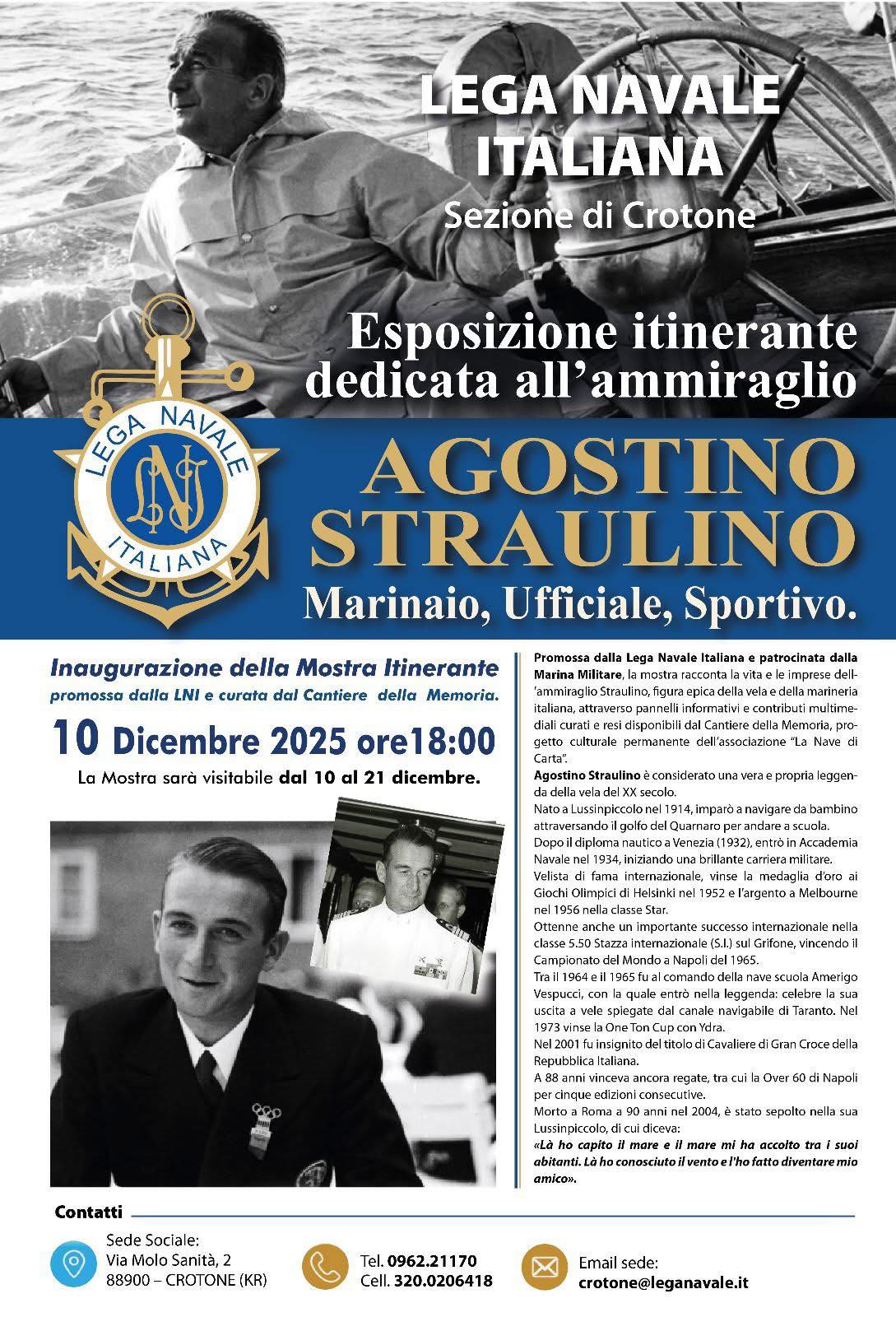 a Lega Navale Italiana – Sezione di Crotone apre le porte a un importante evento culturale: l’esposizione itinerante dedicata all’ammiraglio Agostino Straulino, figura leggendaria della vela italiana e protagonista assoluto della storia della Marina Militare e dello sport internazionale.