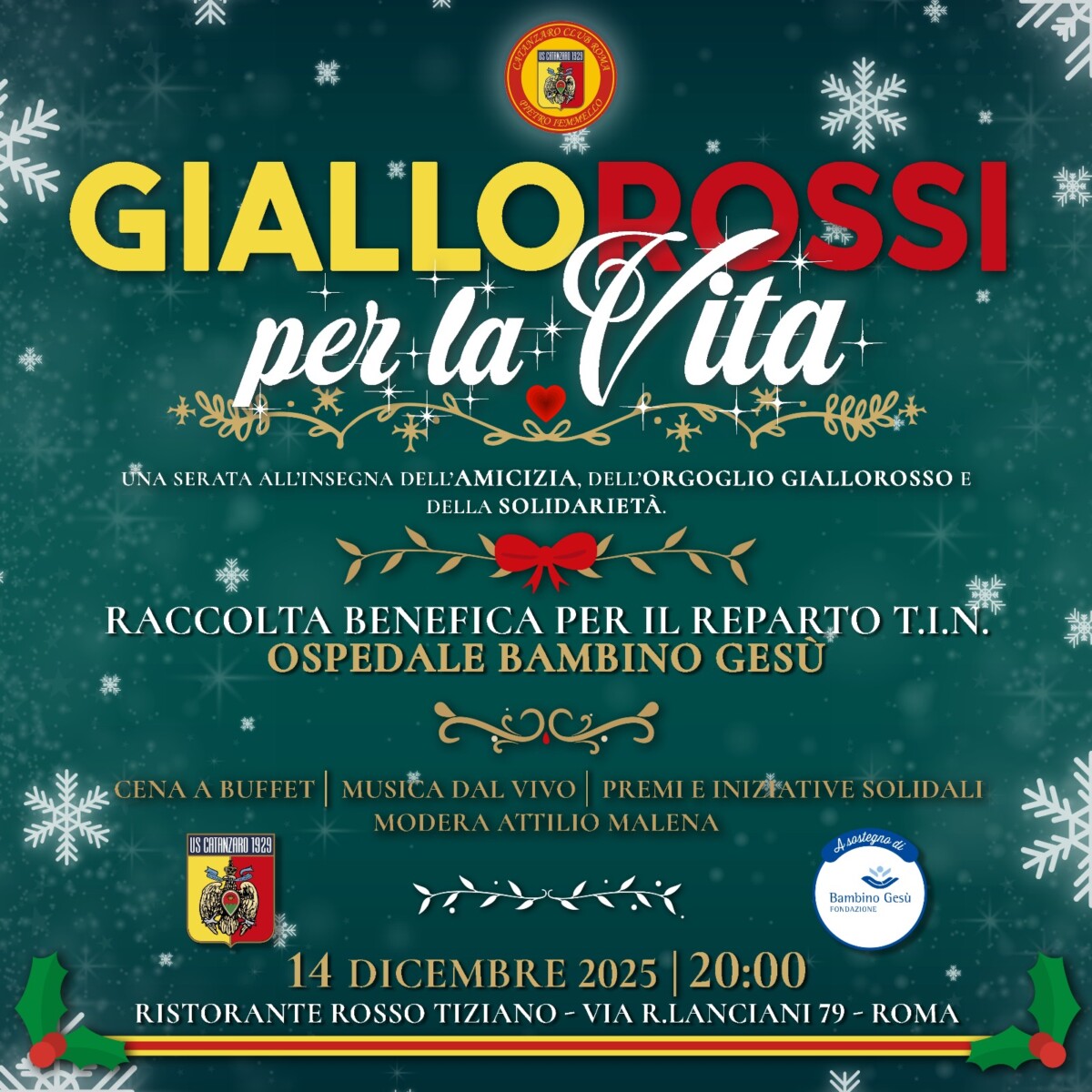 Il Catanzaro Club “Pietro Iemmello” presenta con orgoglio la sua Serata Natalizia Benefica, un appuntamento speciale dedicato alla solidarietà, che si terrà domenica 14 dicembre 2025 alle ore 20:00 presso il Ristorante Rosso Tiziano a Roma.