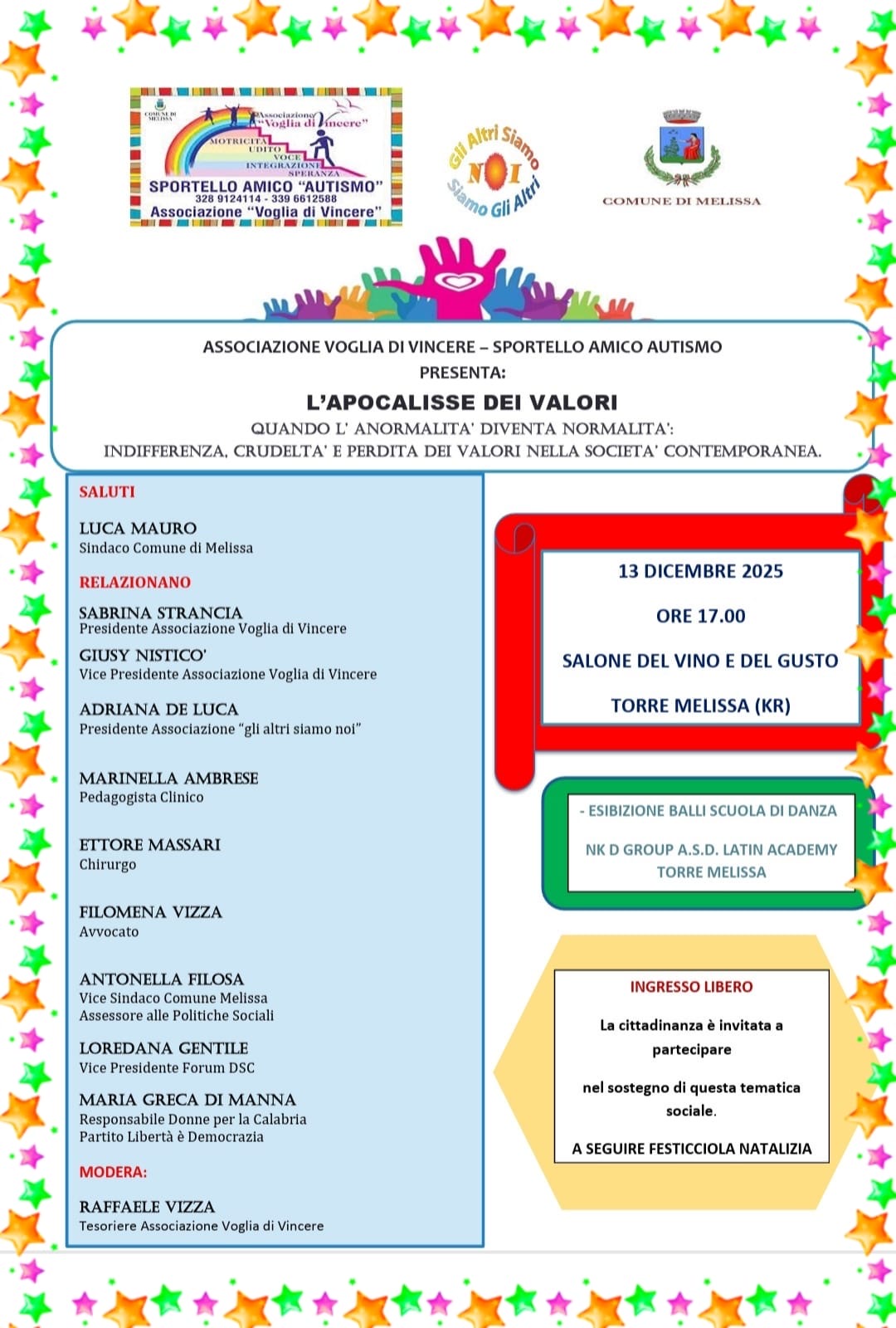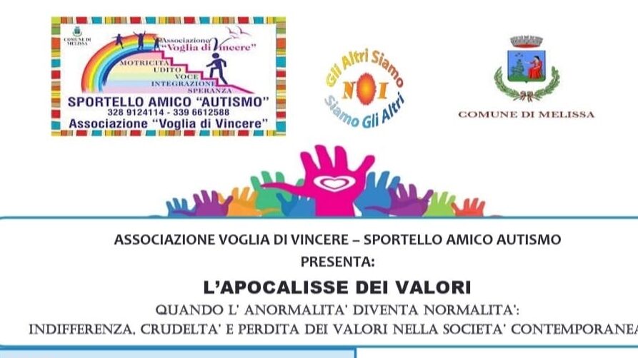 MELISSA (KR) – Si terrà sabato 13 dicembre 2025 alle ore 17.00, presso il Salone del Vino e del Gusto di Torre Melissa, il convegno dal titolo “L’Apocalisse dei Valori – Quando l’anormalità diventa normalità: indifferenza, crudeltà e perdita dei valori nella società contemporanea”, promosso dall’Associazione Voglia di Vincere e dallo Sportello Amico Autismo, con il patrocinio del Comune di Melissa.