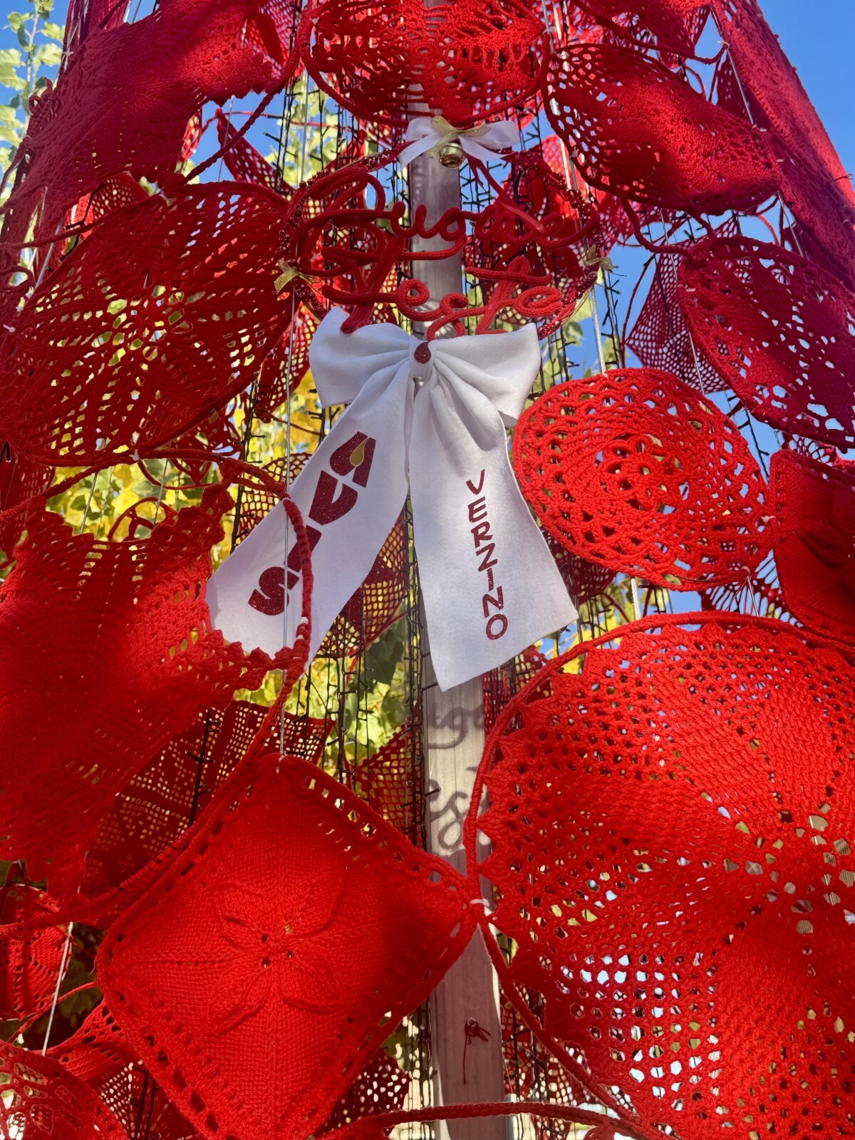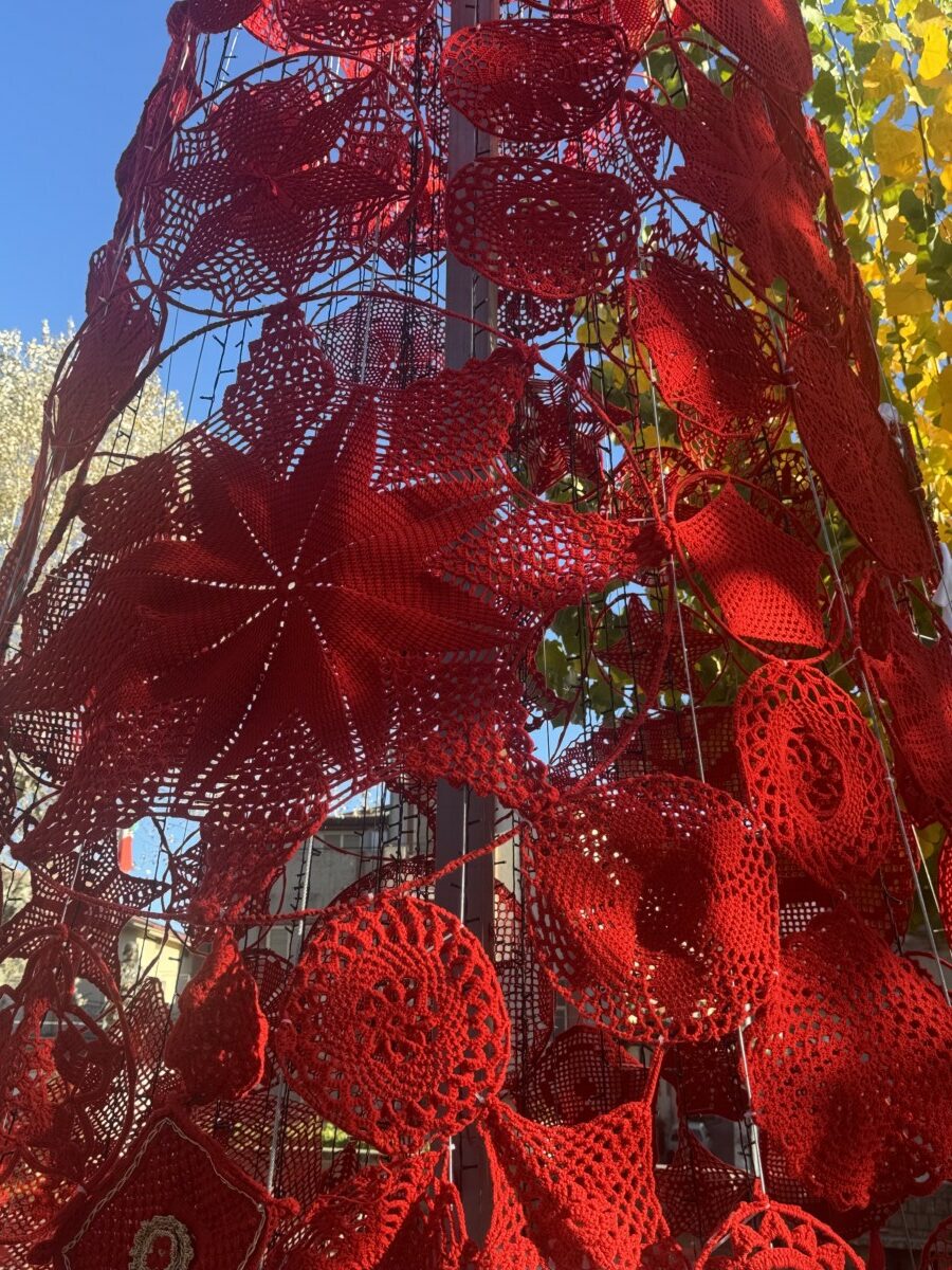 Al centro del progetto ci sono le donne del paese, che per settimane hanno lavorato all’uncinetto creando motivi e cerchi in lana rossa, colore che richiama il gesto della donazione del sangue. La cura dei dettagli, la pazienza e la passione che hanno caratterizzato la realizzazione dei manufatti hanno reso l’albero un vero esempio di artigianato condiviso e di identità locale.