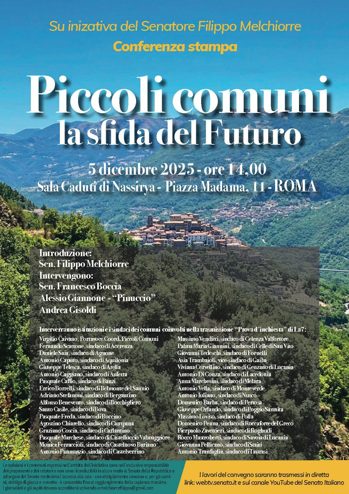 Senato della Repubblica, Sala “Caduti di Nassirya”, 5 dicembre – Si è svolto al Senato l’evento “Piccoli Comuni: la sfida del futuro”, promosso dal Senatore Filippo Melchiorre, per richiamare l’attenzione nazionale sulle difficoltà e sulle potenzialità dei borghi italiani.
