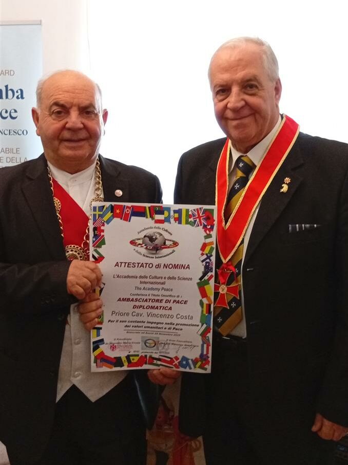 Tra cui, Ambasciatore di Pace è stato nominato anche il Crotonese Cav.  Vincenzo Costa Presidente dell’Associazione Italiana dei Cavalieri , a cui  è stato concesso il Passaporto di Pace Diplomatica .