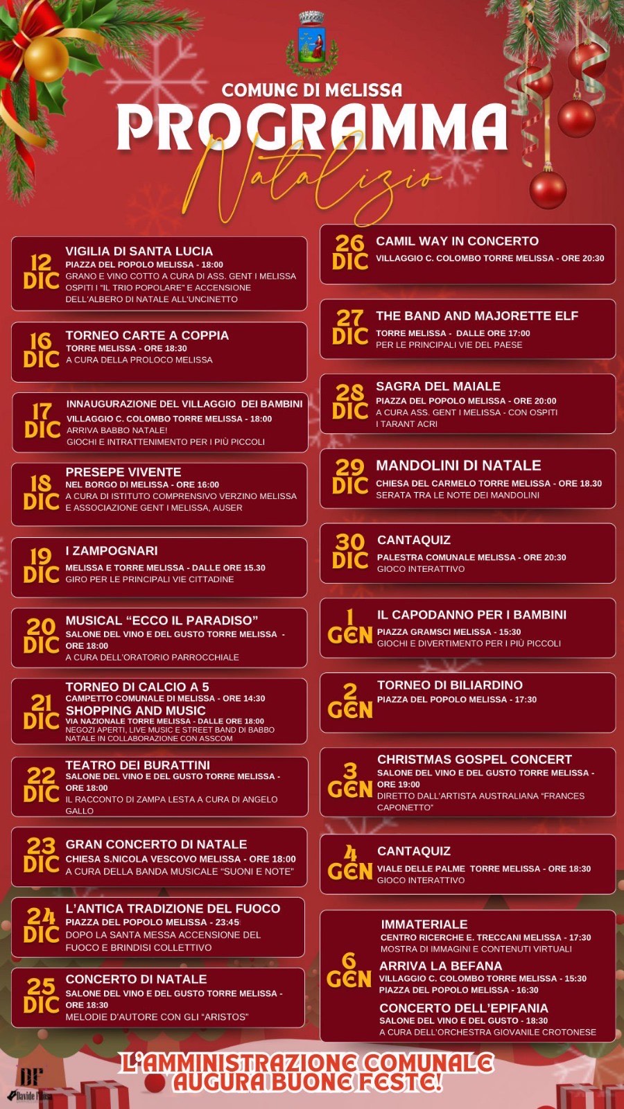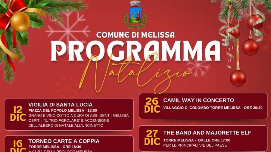 MELISSA (KR), sabato 13 dicembre 2025 – Il Natale non è un tempo condiviso che attraversa i luoghi, le persone e le tradizioni. È un periodo che non consuma, ma rigenera; che non invade, ma abita. Da questa visione nasce il programma socio-culturale natalizio promosso dall’Amministrazione comunale guidata dal Sindaco Luca Mauro, in un percorso partito ieri (12 dicembre) e che si snoda fino a martedì 6 gennaio 2026, tenendo insieme identità, partecipazione e sostenibilità sociale.