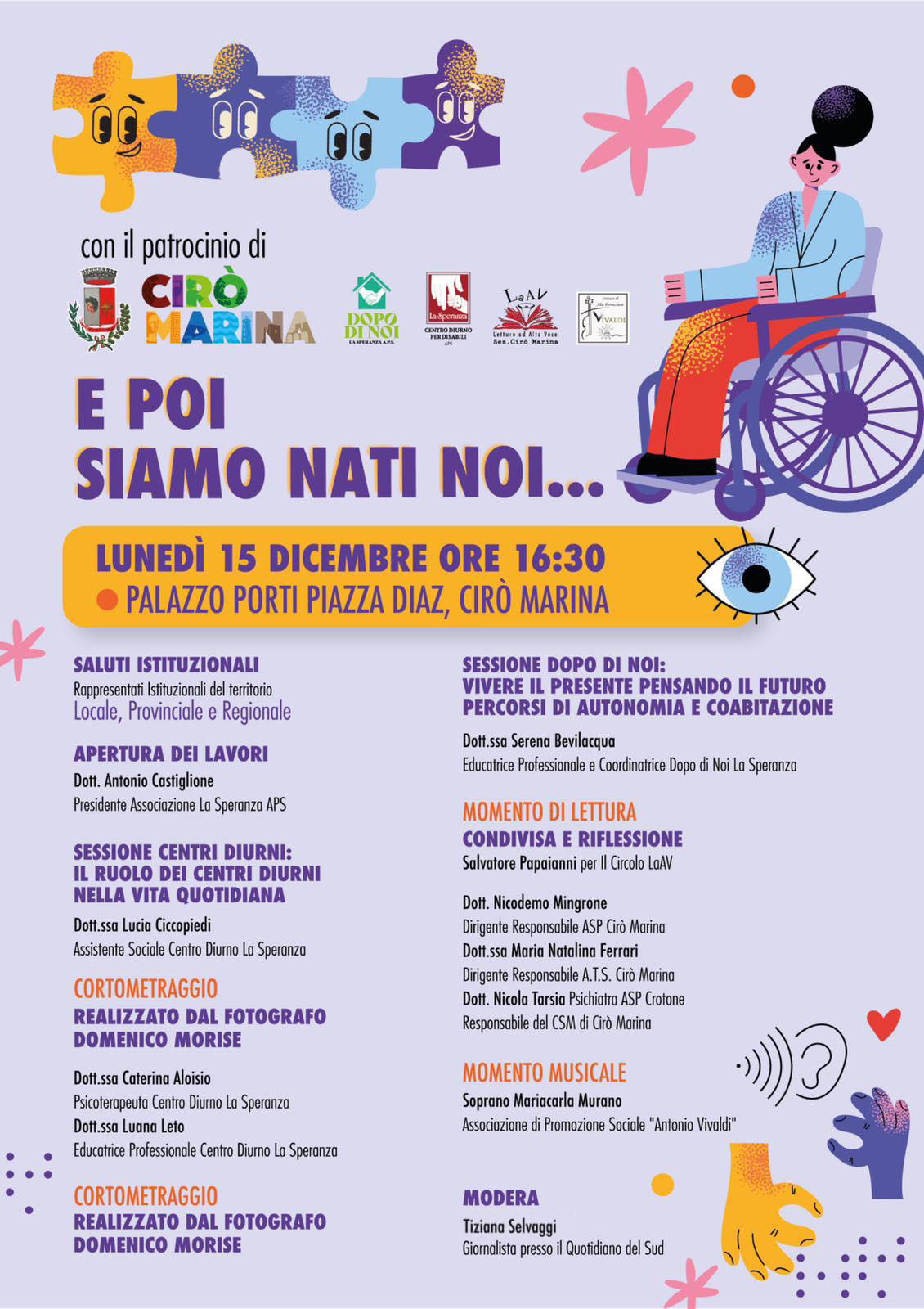 A Cirò Marina, l’Associazione La Speranza APS organizza un incontro pubblico di riflessione e aggiornamento sulle attività dei servizi dedicati alla disabilità. L’appuntamento, intitolato “E poi siamo nati noi…”, si terrà lunedì 15 dicembre presso la sala convegni di Palazzo Porti, con il supporto dell’amministrazione comunale.