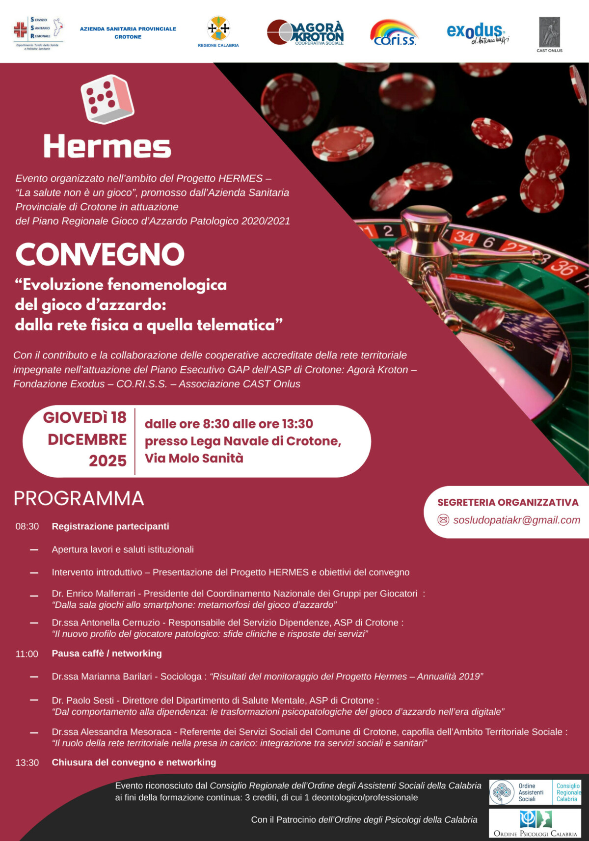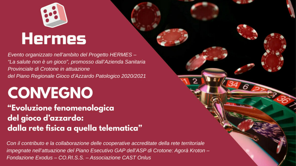Un evento organizzato nell’ambito del Progetto HERMES – “La salute non è un gioco”, promosso dall’Azienda Sanitaria Provinciale di Crotone, in attuazione del Piano Regionale per il Gioco d’Azzardo Patologico (GAP) 2020/2021, con il contributo e la collaborazione delle cooperative accreditate della rete territoriale impegnate nella prevenzione, nella cura e nel supporto alle persone con dipendenze: Agorà Kroton – Cooperativa Sociale, Fondazione Exodus, CO.RI.S.S., Associazione CAST Onlus.