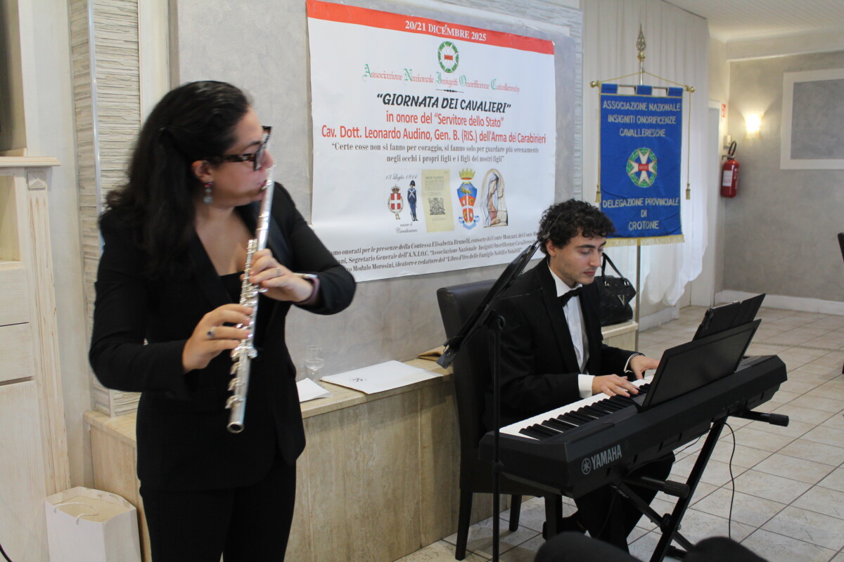 Domenica 21, presso la sala del ristorante San Leonardo di Crotone, la Cerimonia ha avuto inizio con un concerto del Maestro di pianoforte Davide Vincenzo Trocino e dal Maestro Paola Benedetta Precone, che con la loro arte divina hanno allietata l’inizio della cerimonia. A seguire l’Inno di Mameli, i saluti e i ringraziamenti da parte del Cav. Giuseppe Crea, Delegato Provinciale di Crotone e Coordinatore Regionale della Calabria dell’A.N.I.O.C., L’avv. Luca Parente, Cerimoniere, ha cadenzato le premiazioni e gli interventi da parte del Generale Audino, dalla Dott.ssa Mariastella Fedele e dal Conte Enzo Modulo Morosini. A fare le conclusioni è stato il Conte Maurizio Monzani, Segretario Generale dell’A.N.I.O.C., che ha illustrato i valori dell’Associazione. A consegnare l’attestati ai nuovi Cavalieri, Dott. Renato Saraceno, all’Avv. Luca Parente e all’Imprenditore Giovanni Scicchitano, è stato il Conte Enzo Modulo Morosini, a consegnare i diplomi di Nuovi Soci, al Socio Benemerito Generale Audino, al Cav. Ugo Ranieri, al Socio Benemerito Giovanni Scicchitano, al Socio Benemerito Maria Teresa Scicchitano e gli attestati di Merito al Generale Leonardo Audino, al Conte Enzo Modulo Morosini, al Maestro Davide Vincenzo Trocino, al Maestro Paola Benedetta Precone, al Dott. Gabriele Tripodi e alla compagnia di danza “De Creation Crew”, è stato il Conte Monzani, a consegnare le opere del Cav. Uff. Michele Affidato, orafo in Crotone alla Contessa Elisabetta Brunelli Monzani. Alla Dott.ssa Mariastella Fedele, al Cav. Angelo Carella, al Maestro Paola Benedetta Precone, all’Avv. Francesca Laratta, alla Maestra Maria Carmela Caranna, al Cavaliere Salvatore Raimondi e alla Dott.ssa Rosa Caruso, è stata La Contessa Elisabetta Brunelli Monzani. Al Generale Audino, è stata consegnata una colonna d’argento è placata in oro dal Conte Monzani, offerta dalla Delegazione Provinciale di Crotone. La cerimonia si è conclusa con una riffa di 80 premi, omaggiati dai commercianti crotonesi. Il Cav. Crea Ha ringraziato tutti i 132 presenti per avere comperato i biglietti, l’incasso sarà consegnato ai bisognosi.
