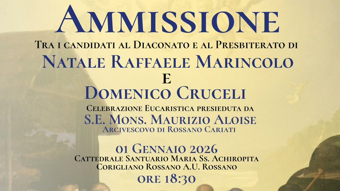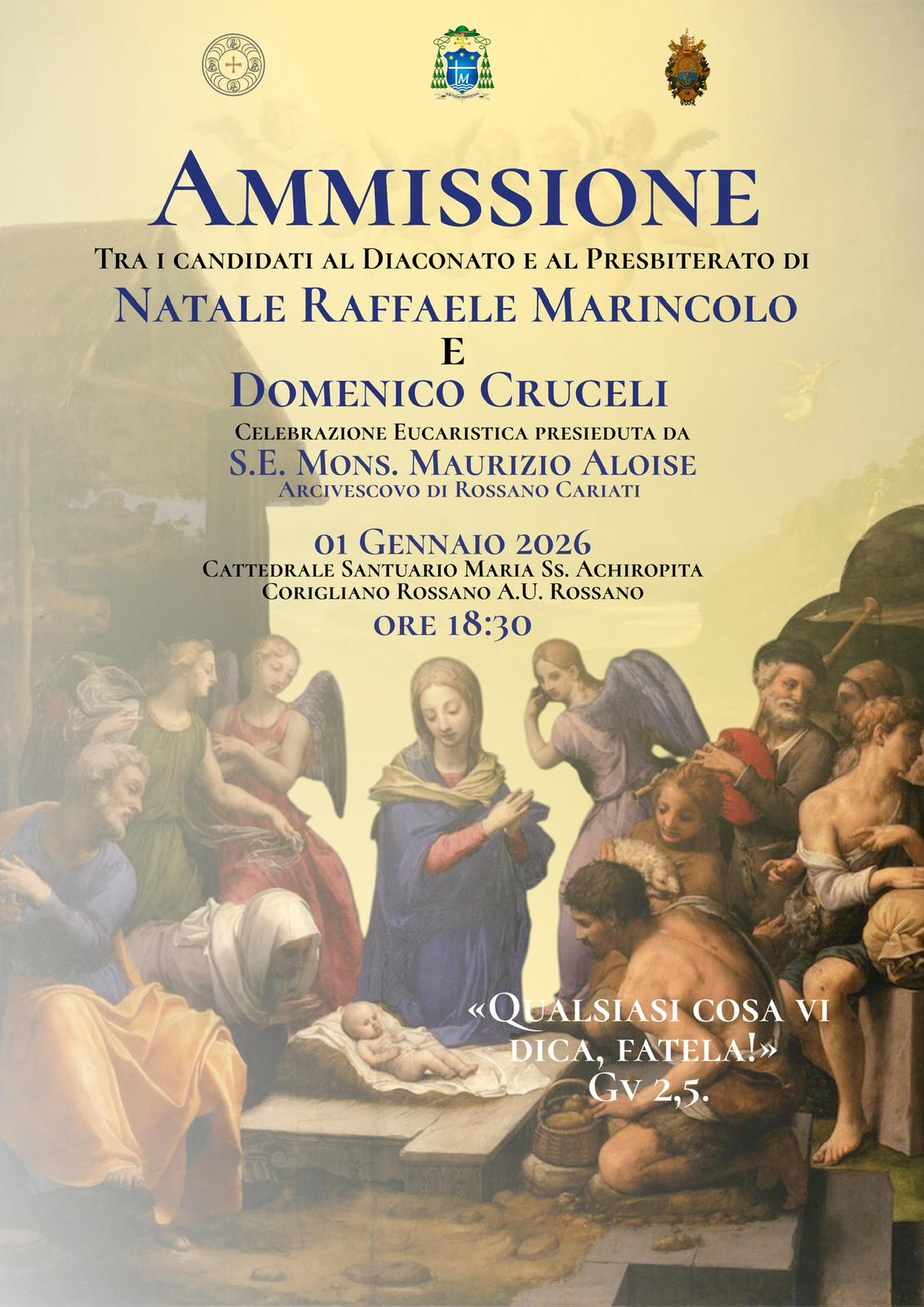 Nella gioia della Solennità del Santo Natale di Nostro Signore Gesù Cristo, nel primo giorno del nuovo anno, alle ore 18:30, nella Cattedrale di Maria Santissima Achiropita in Corigliano-Rossano – A.U. Rossano, si terrà il rito di Ammissione tra i candidati al Diaconato e al Presbiterato di Natale Raffaele Marincolo e Domenico Cruceli.
