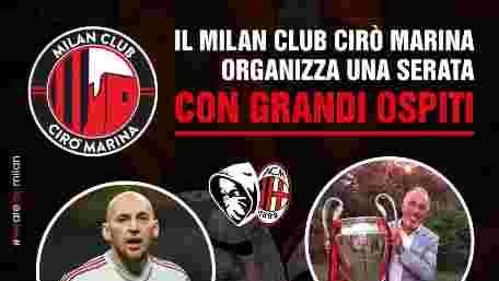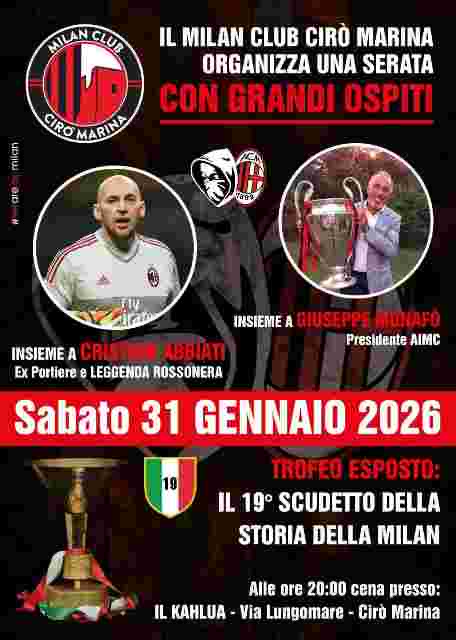 Cirò Marina si tinge di rossonero. Sabato 31 gennaio 2026 il Milan Club Cirò Marina, grazie al Presidente Pietro Doritti e sopratutto al direttivo composto da Andrea Spataro (Vice Presidente), Stefano Doritti, Gabriele Cerchiara, Cataldo Ceraulo, Antonio Fazio, Attilio Fortunato, Vincenzo Doritti, Mario Lione e Gennaro Aversa, organizza una serata-evento di grande richiamo dedicata a tutti gli appassionati dell’AC Milan e del calcio italiano, con ospiti d’eccezione e con il trofeo del 19^ scudetto che sarà esposto dalle ore 14.00 fino alle 19:00 nel Palazzo Porti a Cirò Marina in Piazza Diaz.