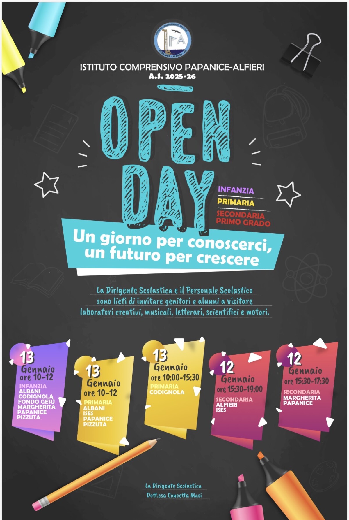 Lunedì 12 gennaio e martedì 13 tornano gli Open Day dell’Istituto Comprensivo Papanice Alfieri, un appuntamento ormai atteso da famiglie e studenti, pensato per aprire le porte delle nostre scuole e offrire un’autentica immersione nei nostri spazi educativi, nei progetti e nella quotidianità che ci caratterizza.
