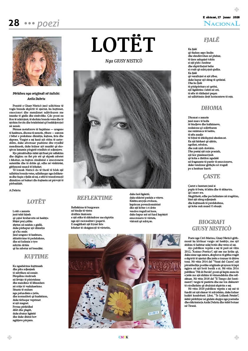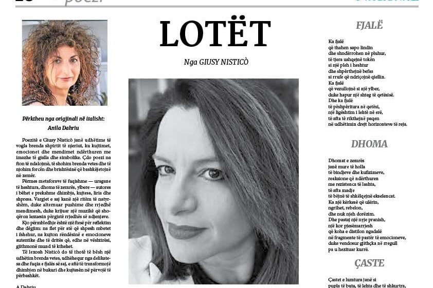 La poesia di Giusy Nisticò varca i confini linguistici e geografici, approdando sulle pagine della stampa culturale albanese con una selezione di liriche intense e profondamente introspettive. Al centro della pubblicazione spicca “Lotët” (“Lacrime”), testo emblematico di una scrittura che indaga l’animo umano con delicatezza e forza insieme, accompagnato da altre composizioni che raccontano memoria, parola, tempo ed emozione.