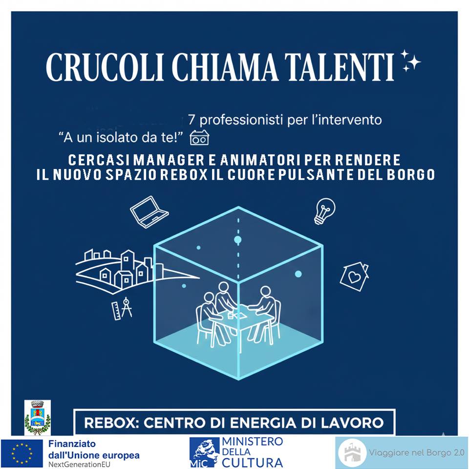 Un’opportunità per il territorio: “Non stiamo solo cercando collaboratori, ma veri e propri motori di cambiamento” commenta l’Assessore Gianfranco Gagliardi. “Con l’attivazione del Rebox e l’impiego di queste professionalità, Crucoli si candida a diventare un modello di rigenerazione dove la bellezza del borgo incontra le opportunità del futuro”.