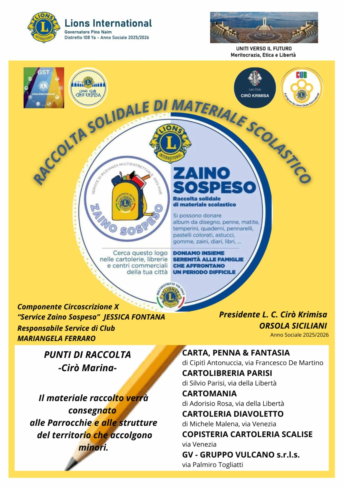 Continua l’impegno del Lions Club Cirò Krimisa nel perseguimento degli obiettivi programmati per l’anno sociale 2025/2026, fra i quali l’annuale appuntamento con il Service “Zaino Sospeso”.