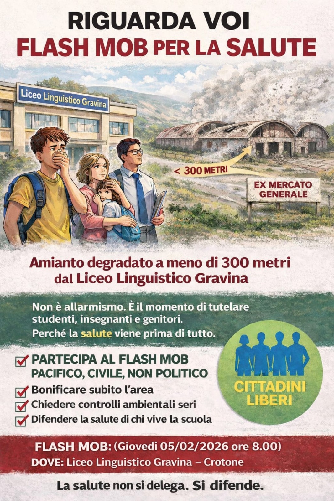 CROTONE – Giovedì 5 febbraio 2026, alle ore 8:00, davanti al Liceo Linguistico Gravina si terrà un flash mob per la salute, un’iniziativa civile e pacifica che coinvolgerà studenti, insegnanti e genitori.