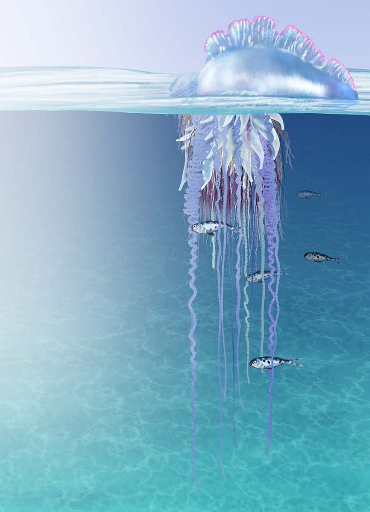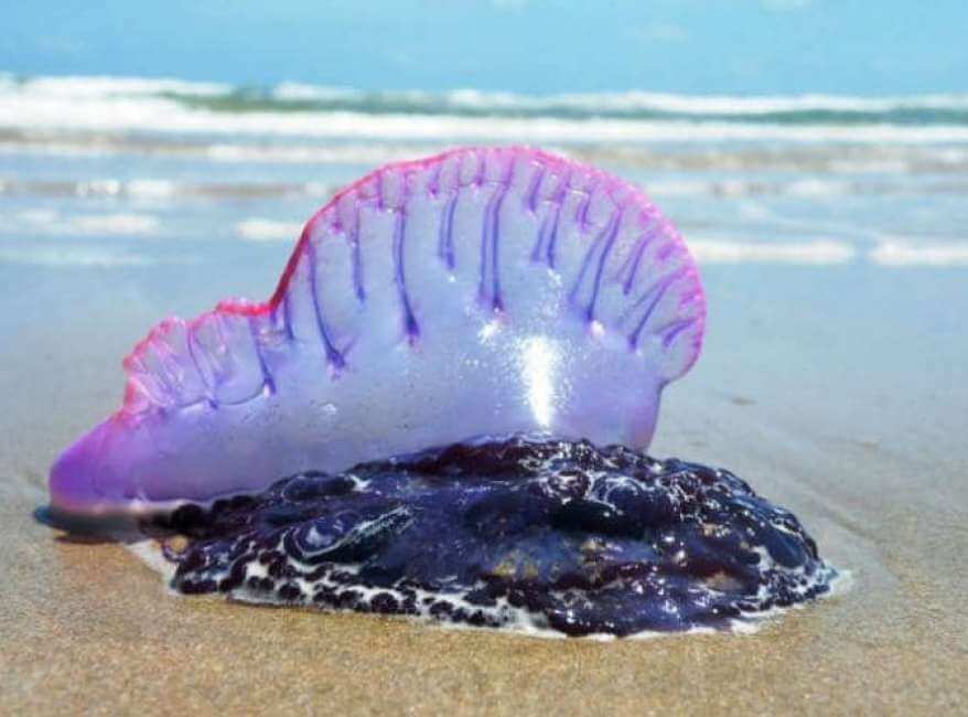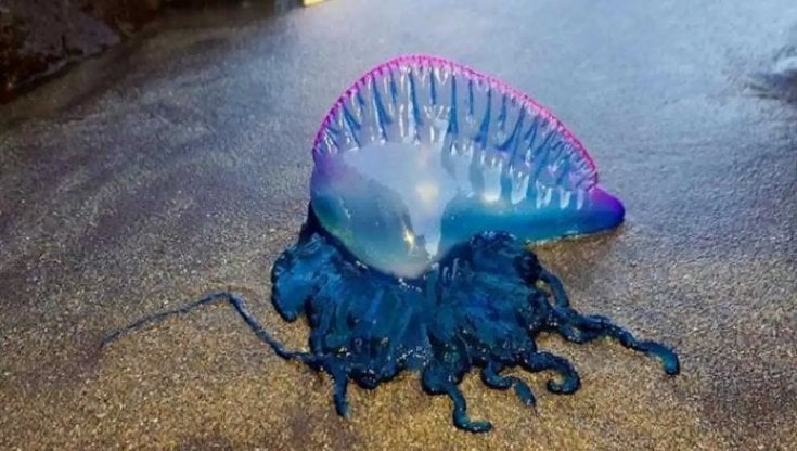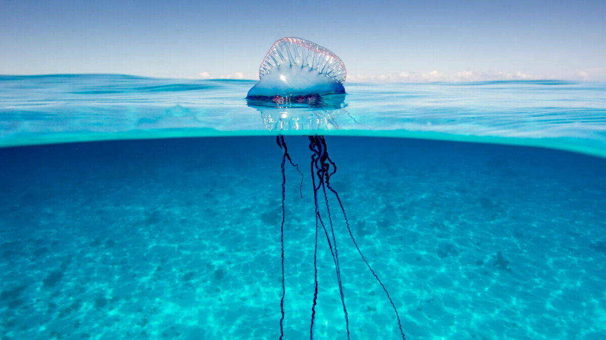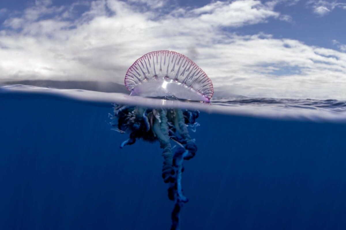 Riconoscere la Caravella portoghese è fondamentale per evitare incidenti. Occorre prestare attenzione alla presenza in superficie di una piccola “vela” gelatinosa dai colori blu, viola o rosati, spesso lucida e leggermente sollevata dall’acqua, alla quale sono collegati sottili filamenti pendenti. A differenza delle comuni meduse, non presenta un’unica campana tondeggiante ma una struttura irregolare e allungata. Sulle spiagge può apparire come un involucro trasparente accompagnato da cordoncini blu scuro: in nessun caso deve essere toccata.