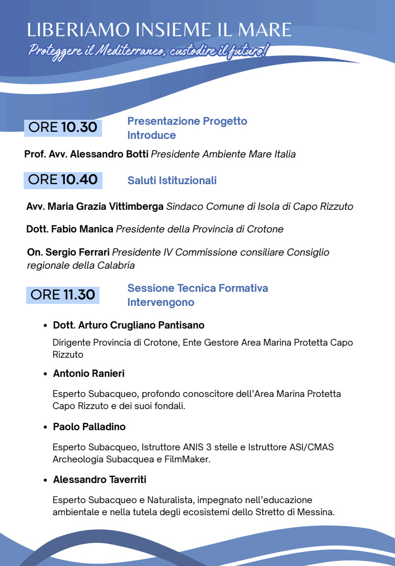 Prenderanno parte all’incontro: l’avvocato Maria Grazia Vittimberga, sindaco di Isola di Capo Rizzuto; il dottor Fabio Manica, presidente della Provincia di Crotone; l’Onorevole Sergio Ferrari, presidente della IV Commissione consiliare del Consiglio regionale della Calabria. La presenza delle istituzioni locali e regionali è la dimostrazione che la tutela del mare può e deve diventare asse centrale delle politiche territoriali, integrando ambiente, sviluppo sostenibile e partecipazione civica.