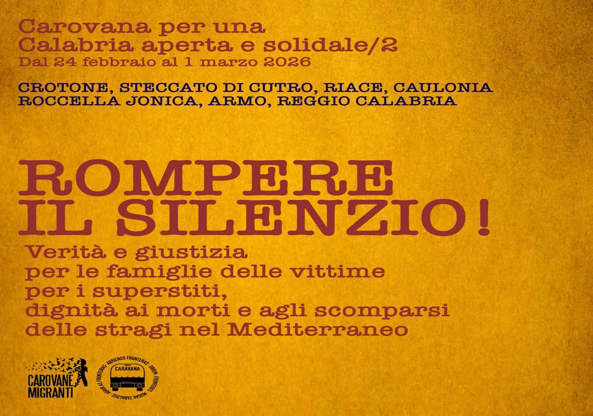 Prende il via il 24 febbraio la Carovana per una Calabria aperta e solidale, un percorso di incontri, iniziative pubbliche, momenti di riflessione e commemorazione che attraverserà Crotone, Cutro, Riace, Caulonia e Reggio Calabria fino al 28 febbraio. Un viaggio collettivo che unisce associazioni, familiari delle vittime, attivisti, giuristi e cittadini per tenere viva la memoria delle vittime delle rotte migratorie e rilanciare il tema dei diritti, dell’accoglienza e della solidarietà.