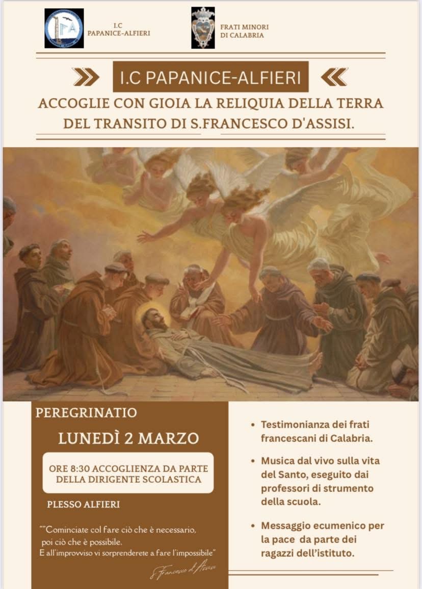 L’Istituto Comprensivo Papanice Alfieri si prepara a vivere un momento di profonda spiritualità e condivisione. Lunedì 2 marzo, alle ore 8:30, presso il plesso Alfieri, giungerà la Reliquia della Terra del Transito di San Francesco d’Assisi.