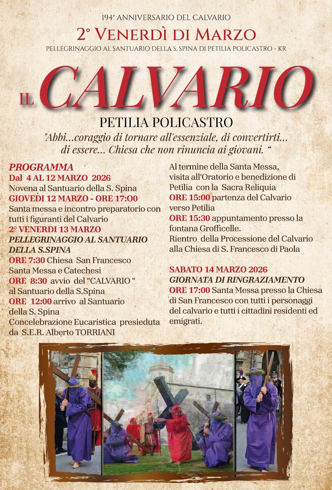 Il Comune di Petilia Policastro, insieme al gruppo Natess, alla Famiglia Mariana “Le 5 Pietre” e agli Ardorini, rende noto l’imminente celebrazione del 194° anniversario della storica manifestazione religioso-culturale del “Calvario” al Santuario della Santa Spina.