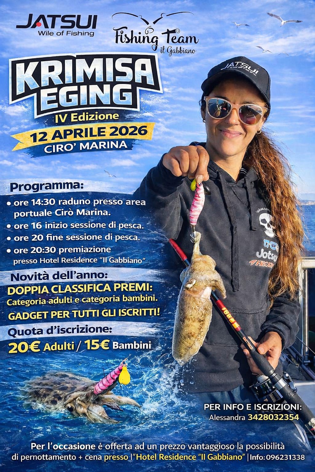 Appuntamento con il mare, la passione per la pesca sportiva e il divertimento per tutte le età. Domenica 12 aprile 2026 a Cirò Marina si svolgerà la quarta edizione del “Krimisa Eging”, evento dedicato alla pesca ai cefalopodi organizzato dal Fishing Team Il Gabbiano in collaborazione con il brand di attrezzature da pesca Jatsui.